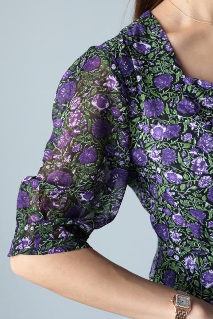 袖にはシフォン生地を使用しており柔らかく動きのある女性らしいシルエットに。
