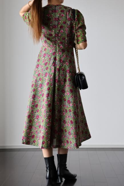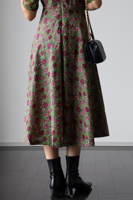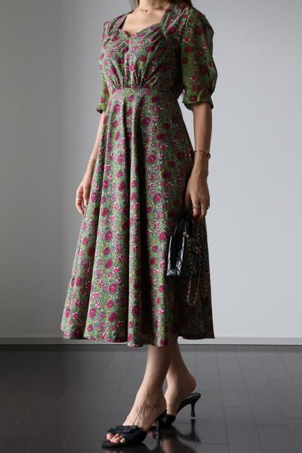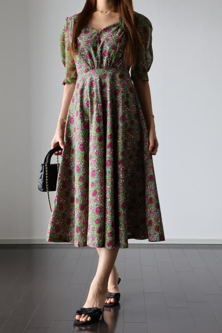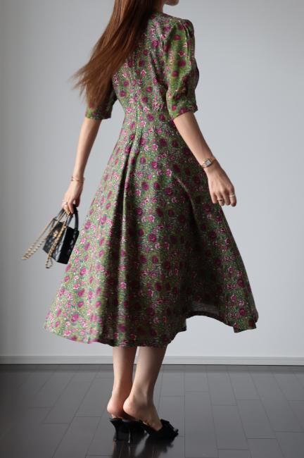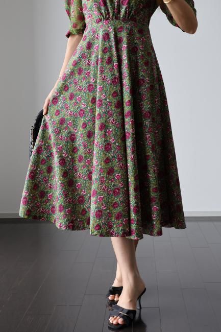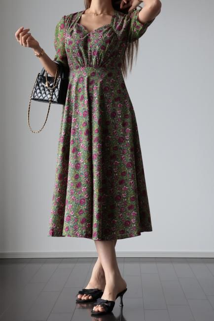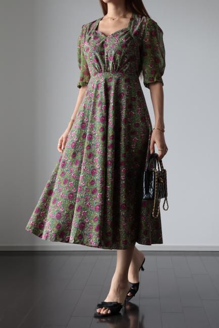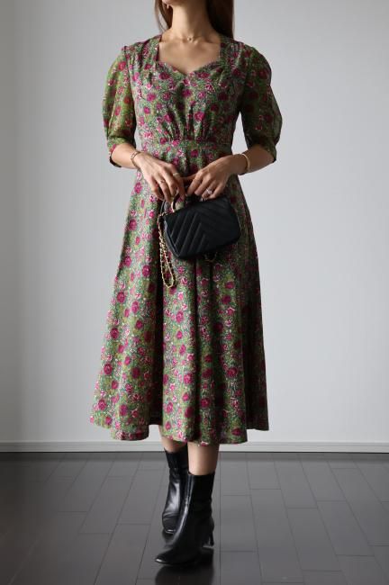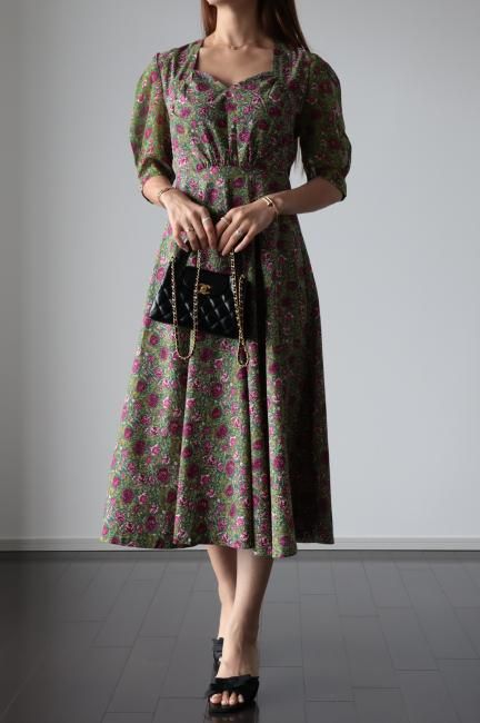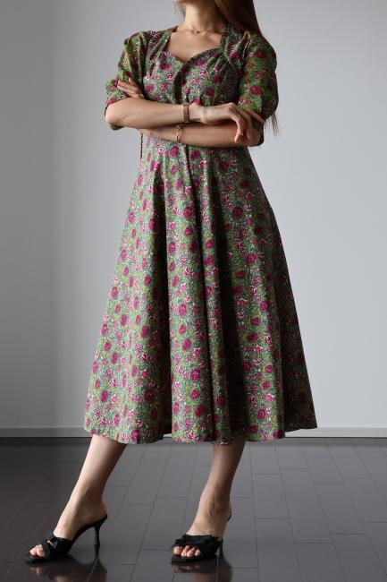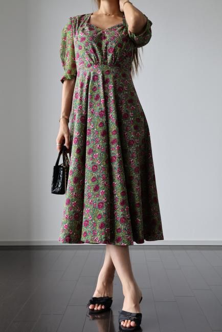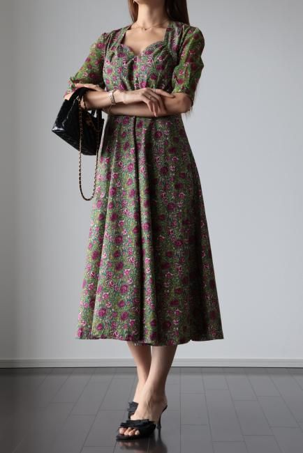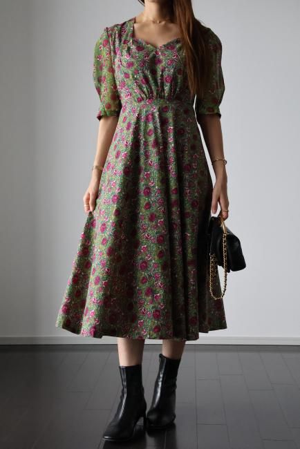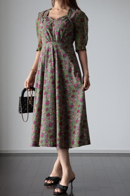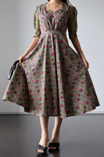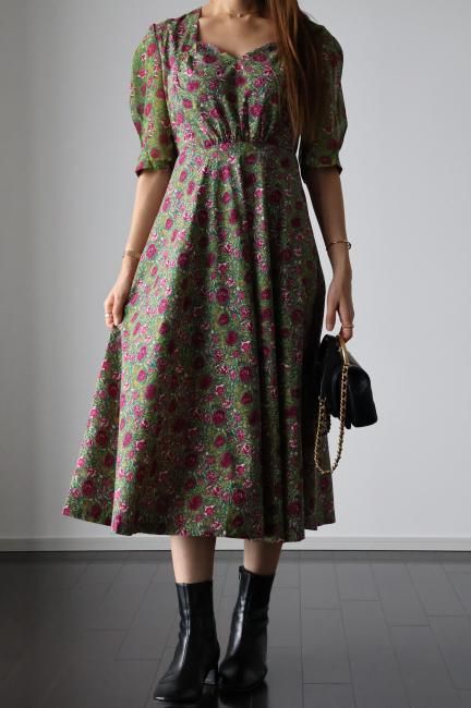 グリーン×レッドの花柄がvintageライクな印象を演出してくれるフレアワンピース❤︎