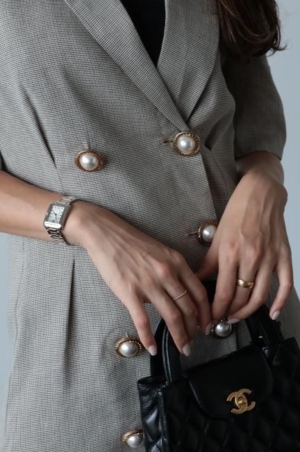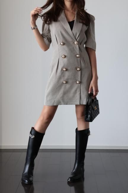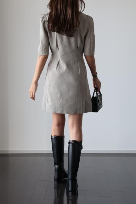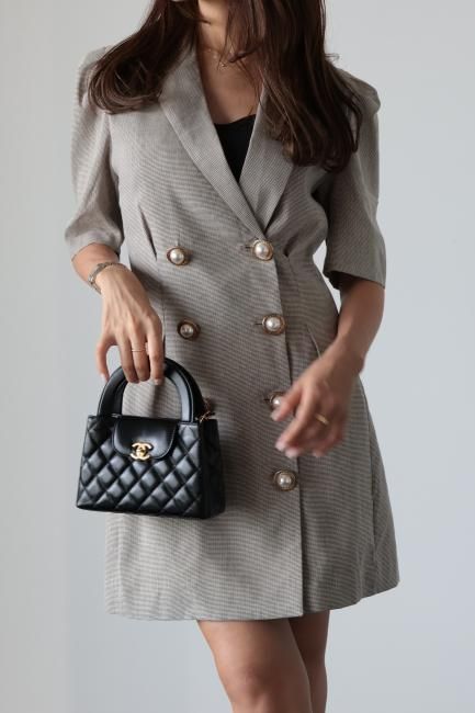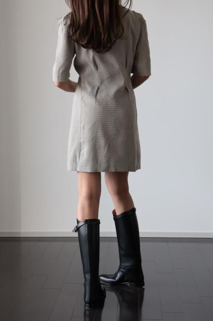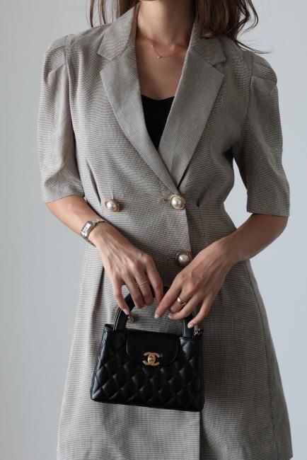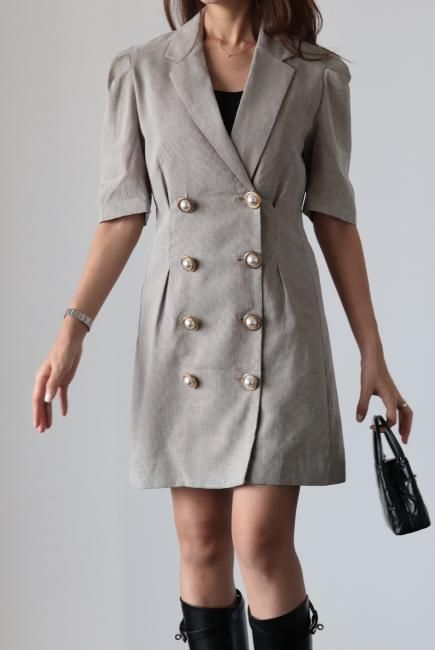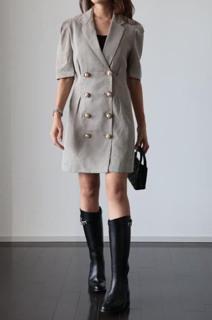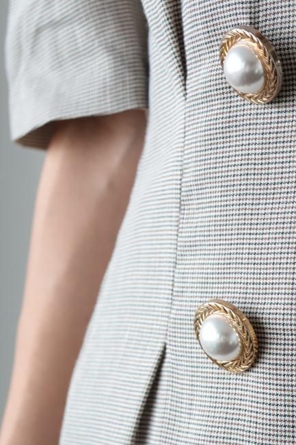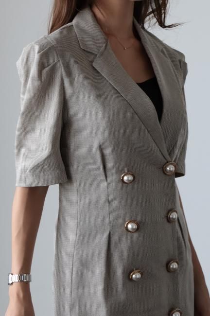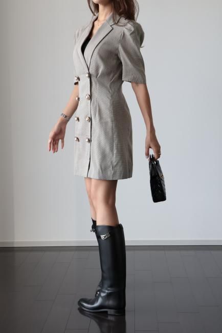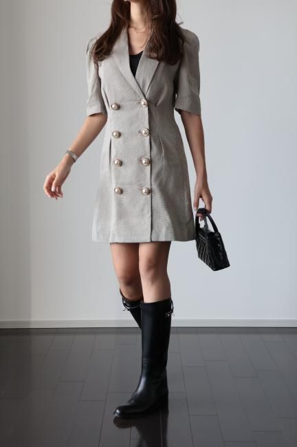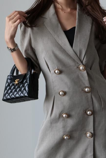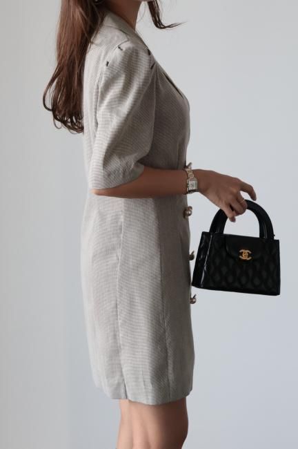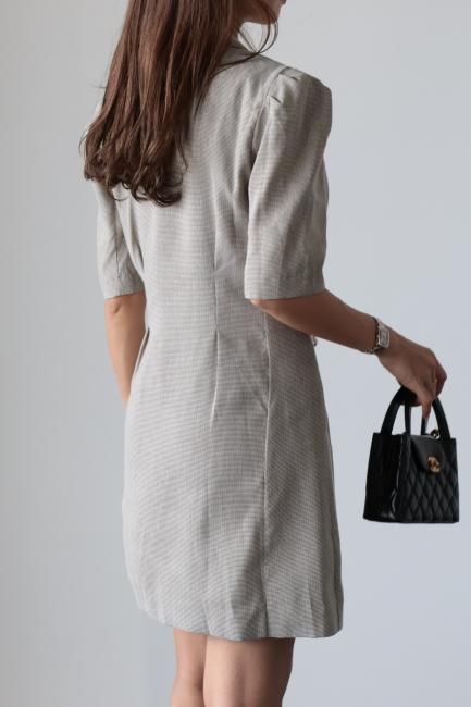 大きなパールボタンがポイントになったノッチドラペルチェックドレス