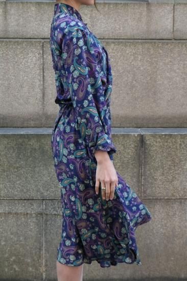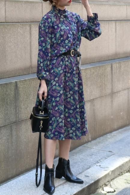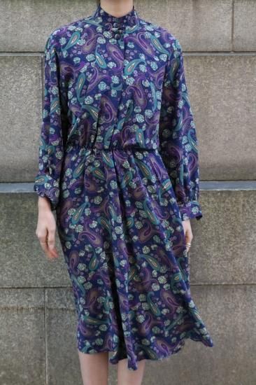 ¡Úvintage¡Ûstand collar fly front button paisley pattern flare dress