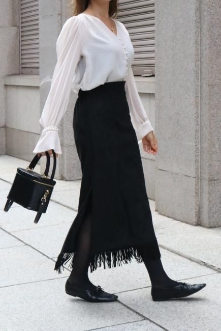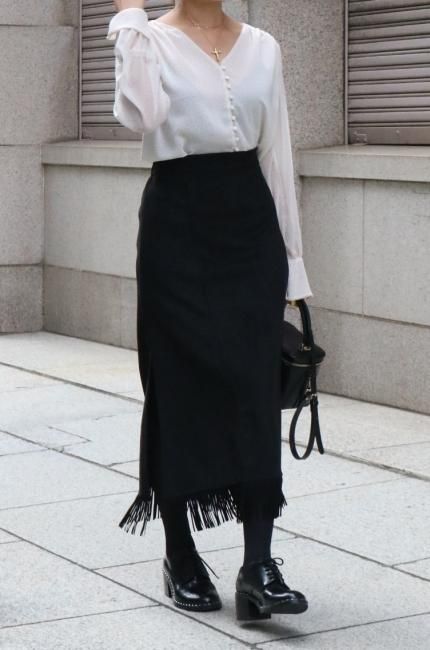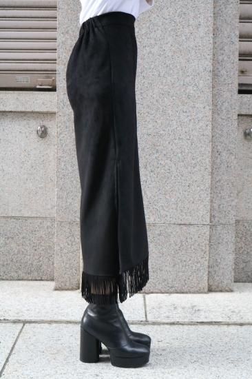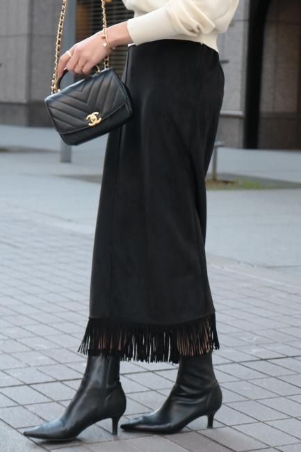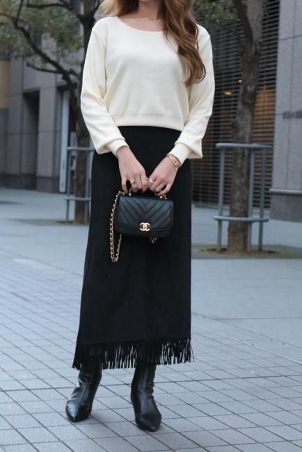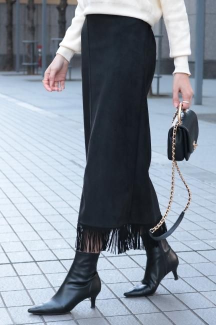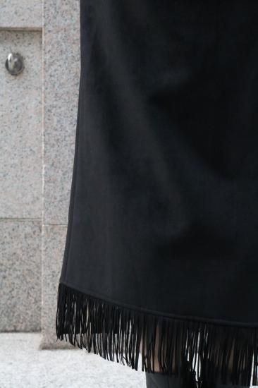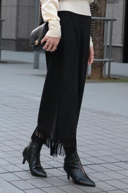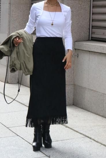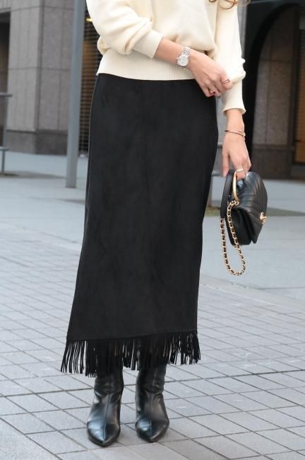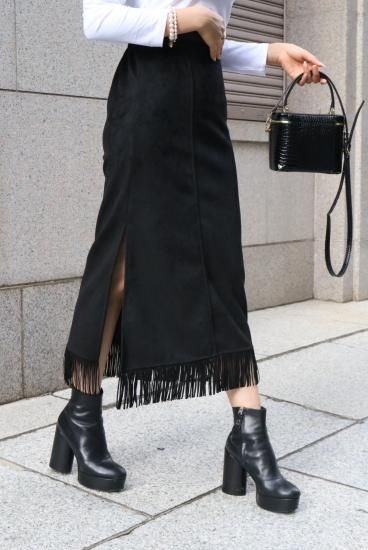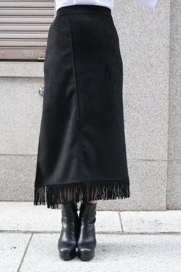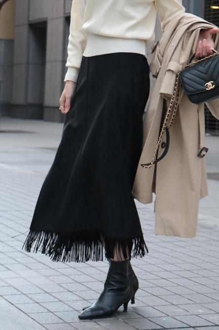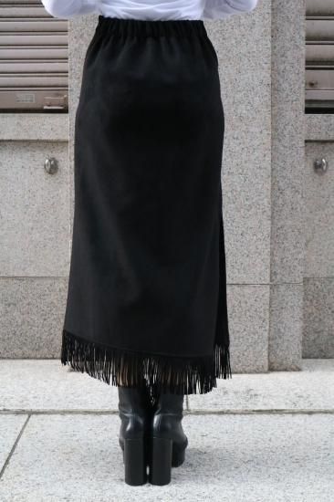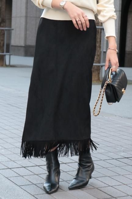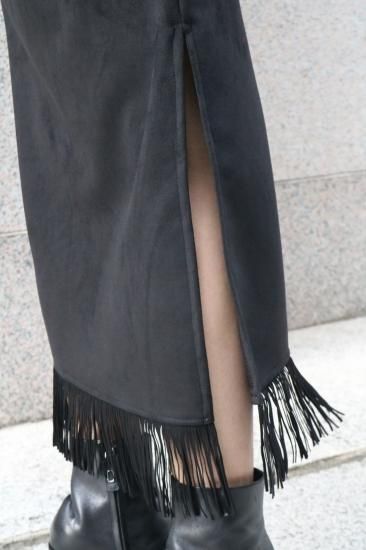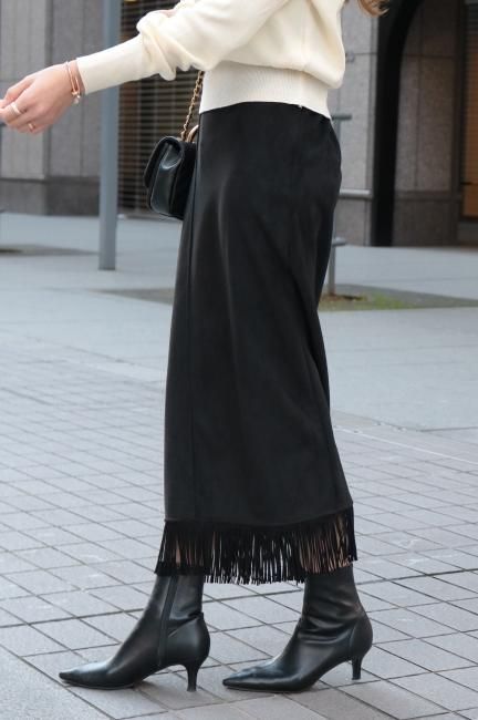 伸縮性のあるスエード地にフリンジがポイントになったスエードトラペーズスカート。