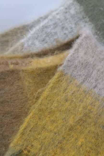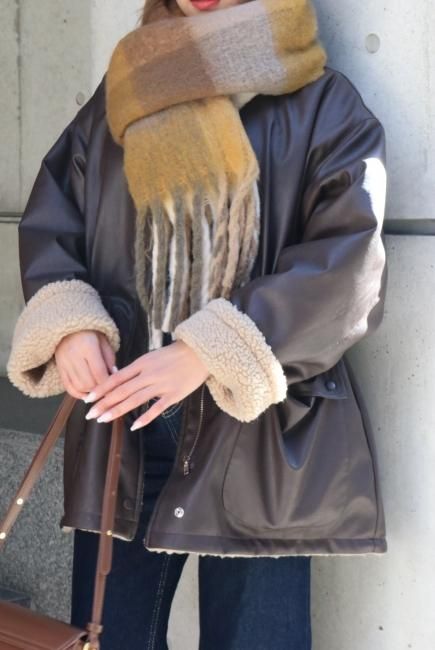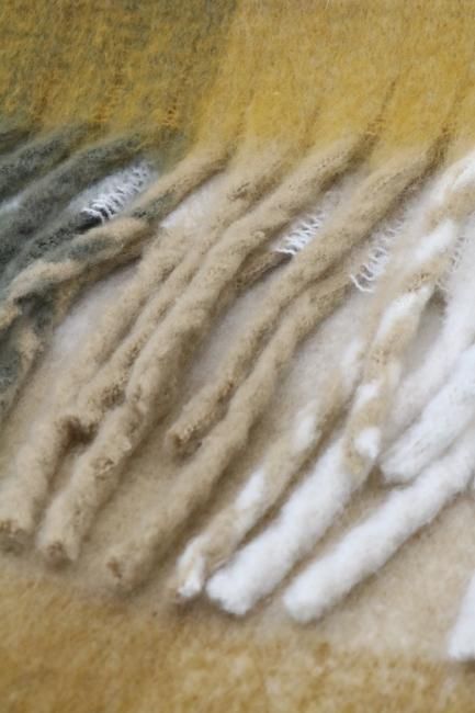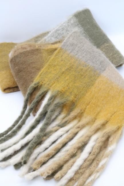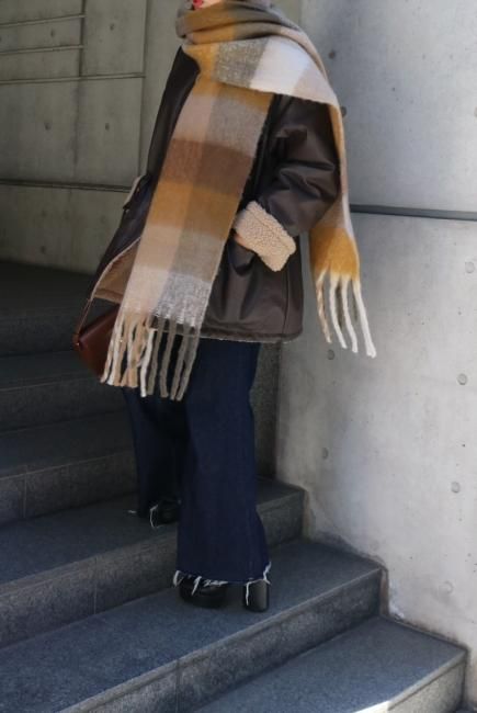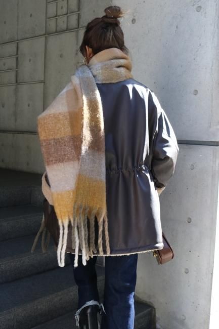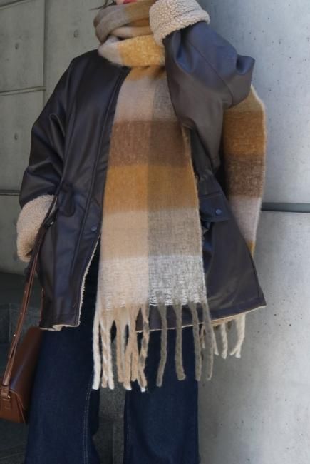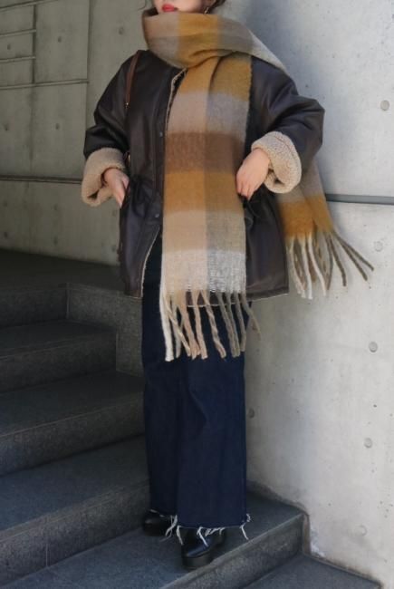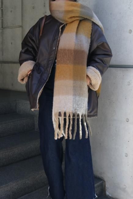 大きなボックスチェックがポイントになったフリンジマフラー。