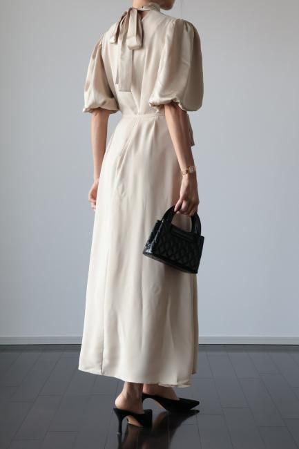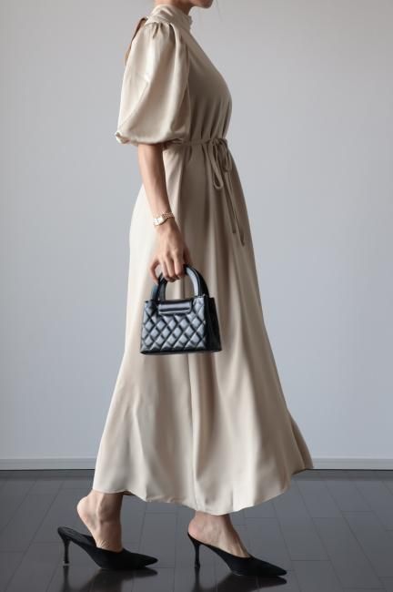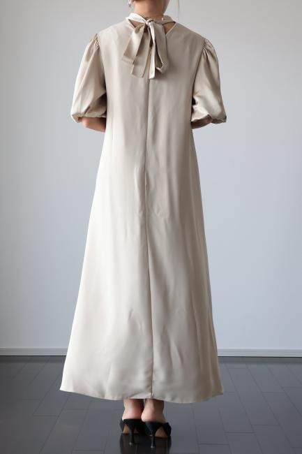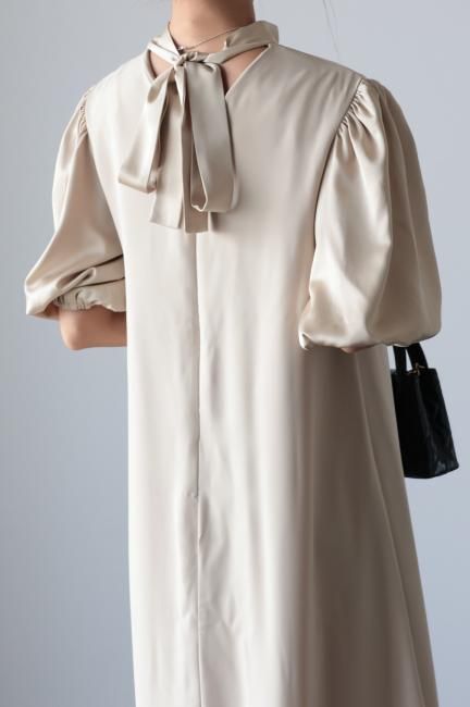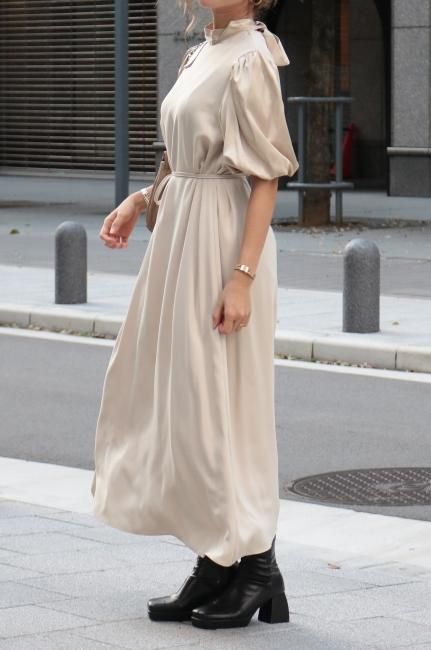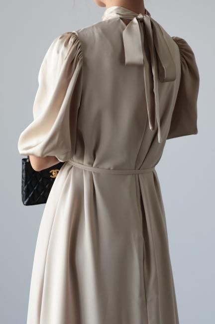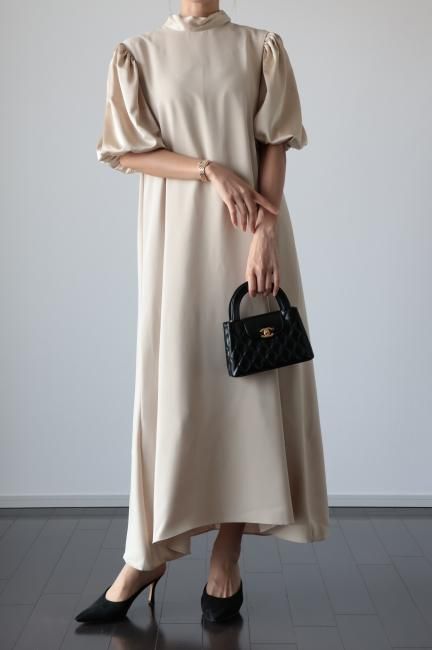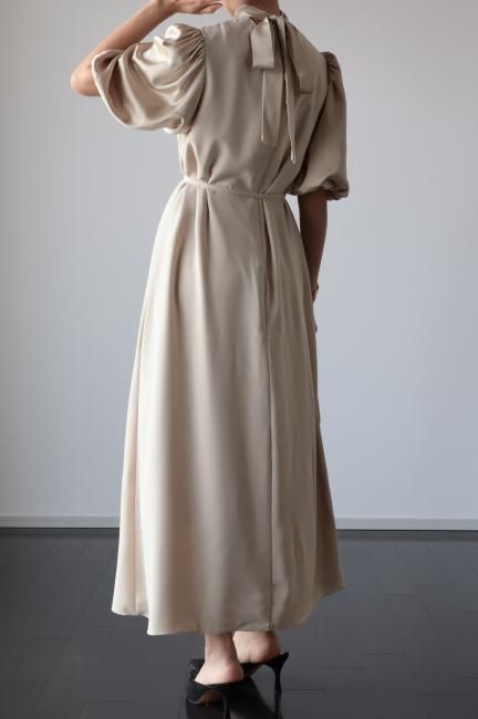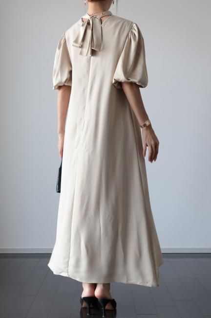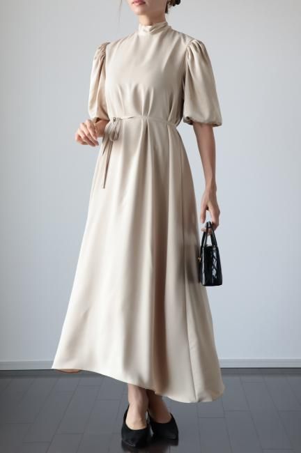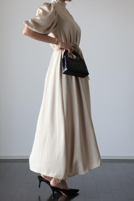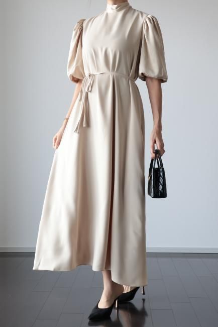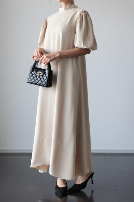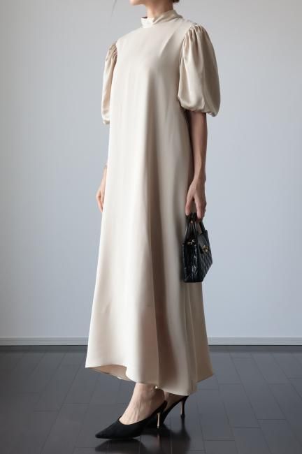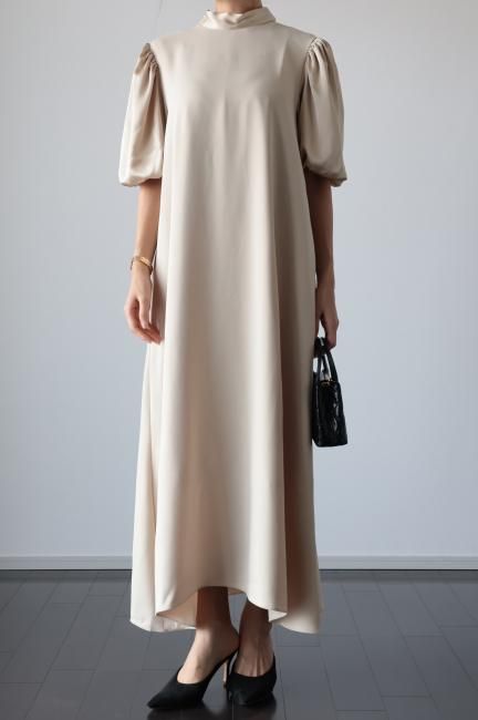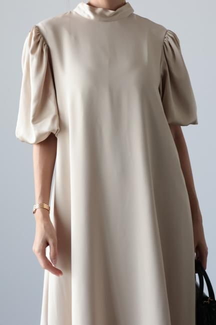 stand satin collar puff sleeves long sack dress / beige