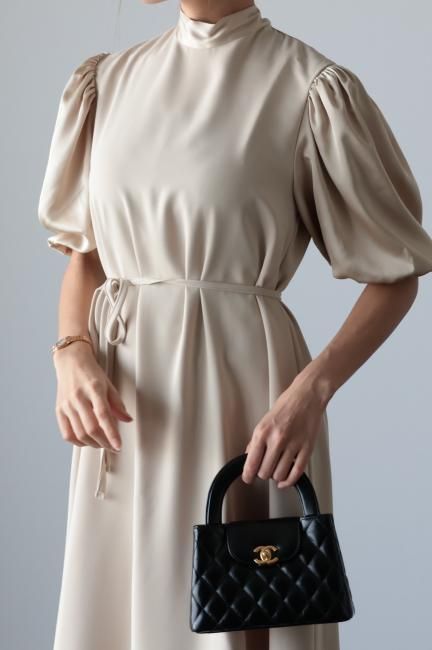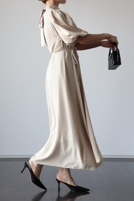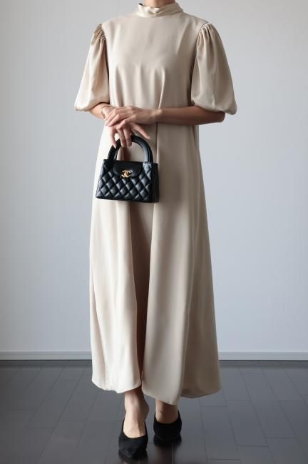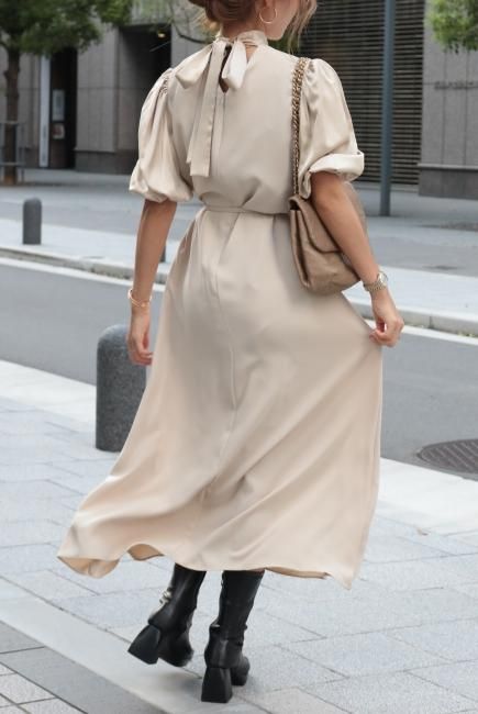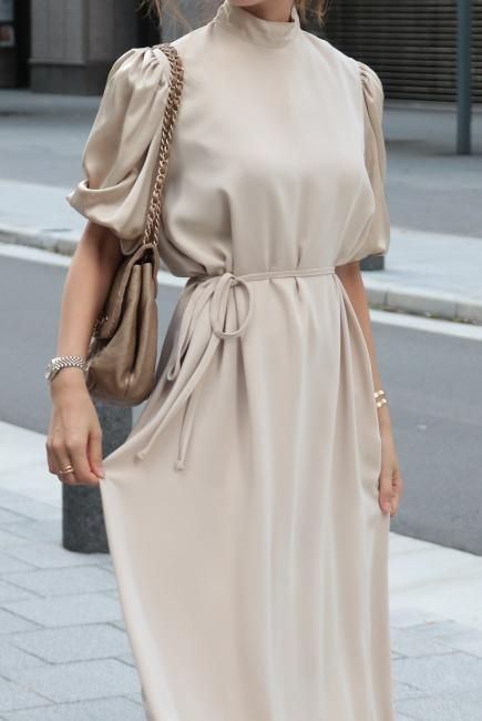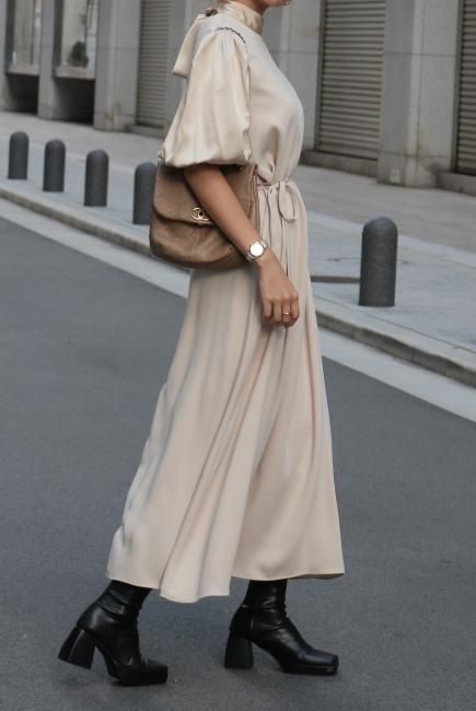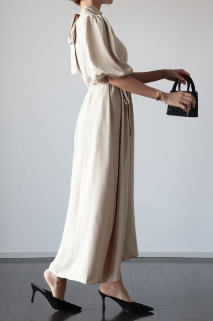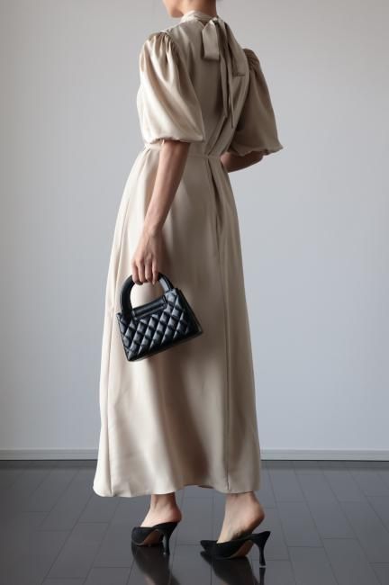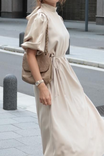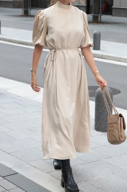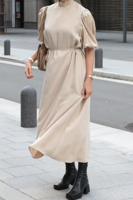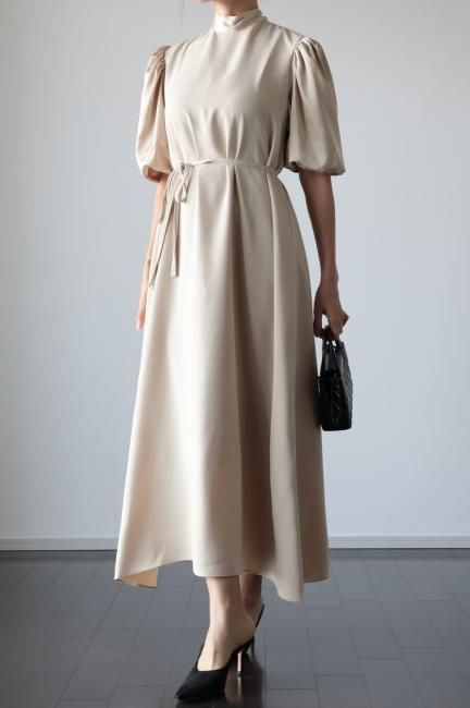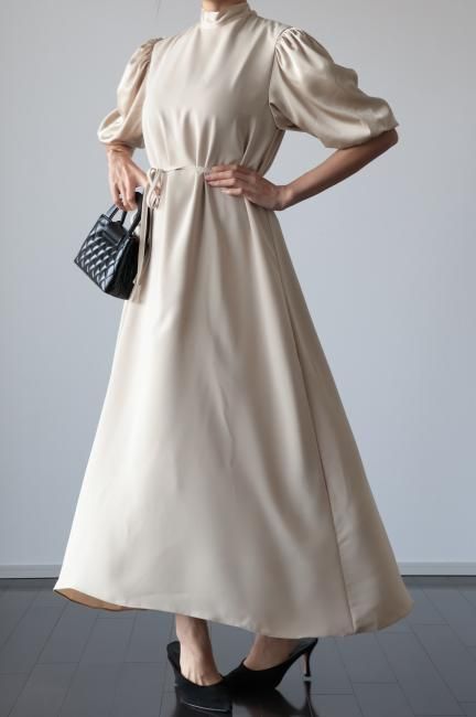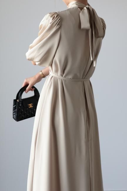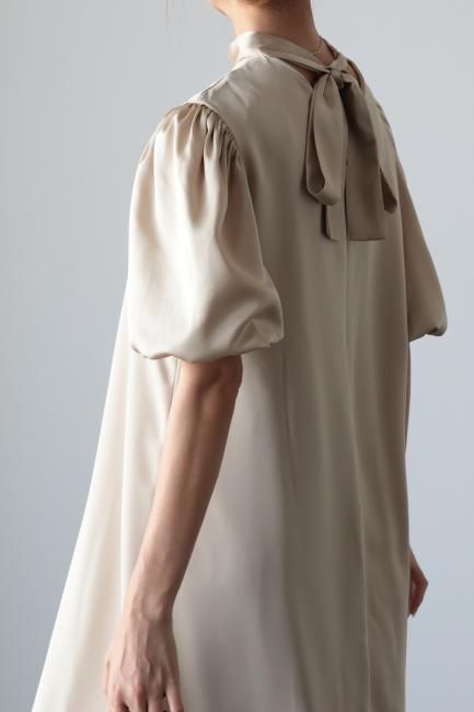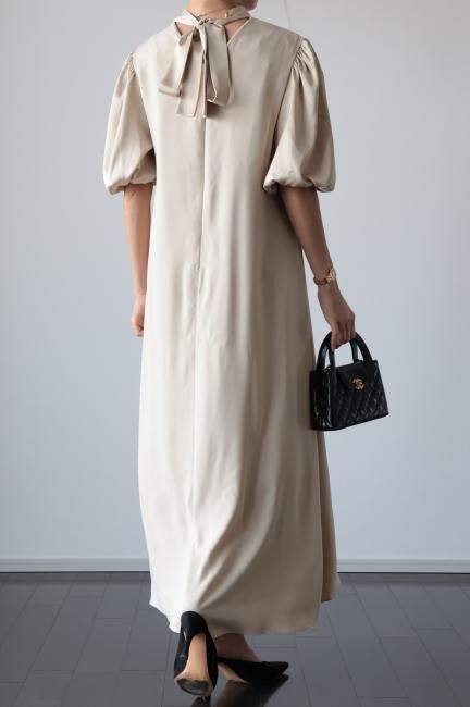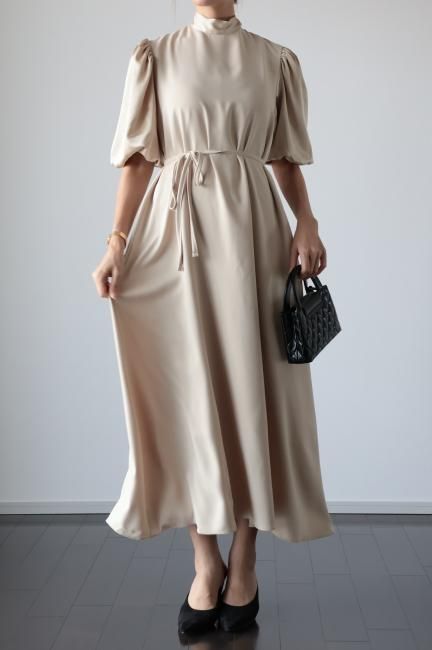 stand satin collar puff sleeves long sack dress / beige