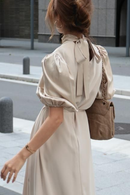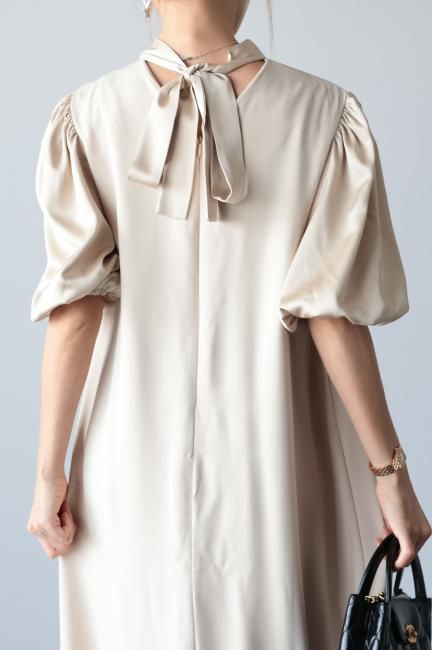 首元のリボンとパフスリーブがサテン生地になっており、異素材mixの高級感のある上品な印象でご着用いただけるオケージョンドレスです。