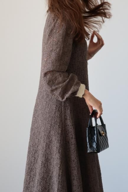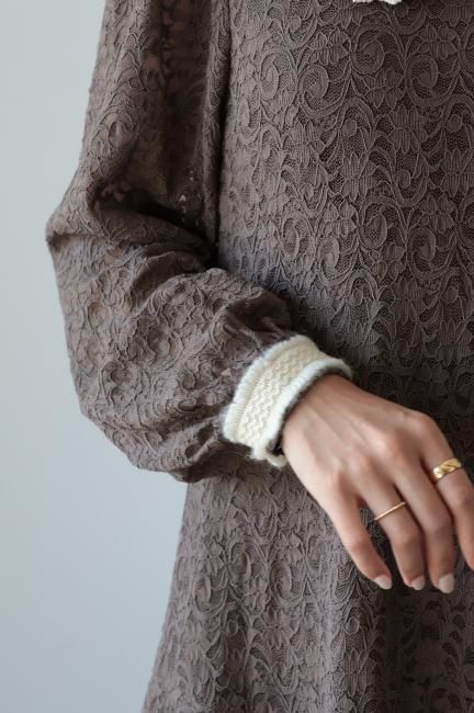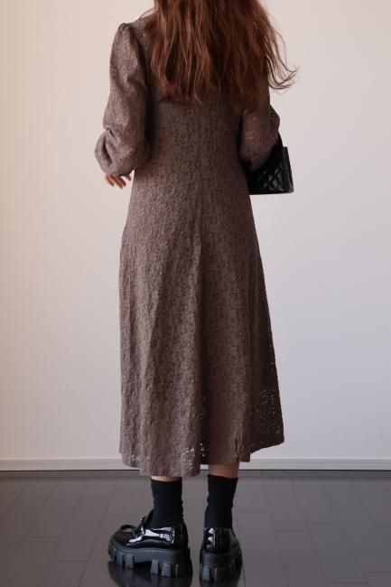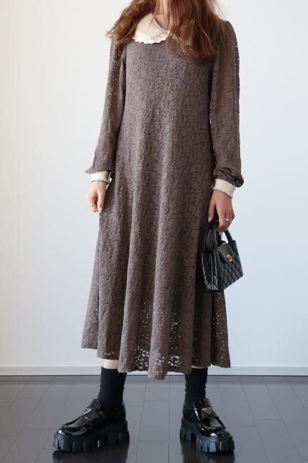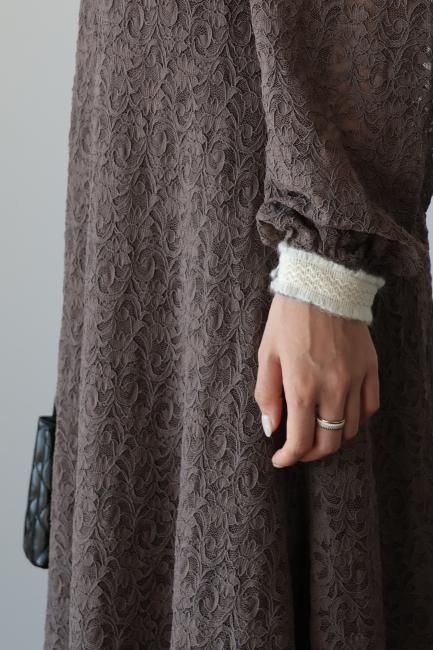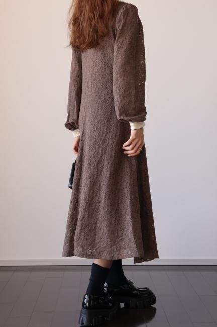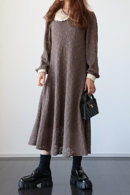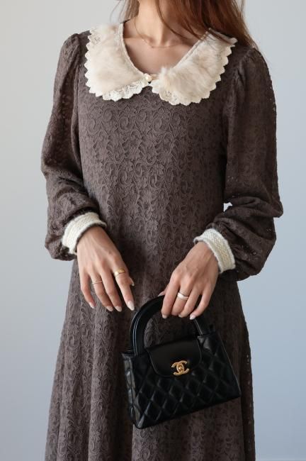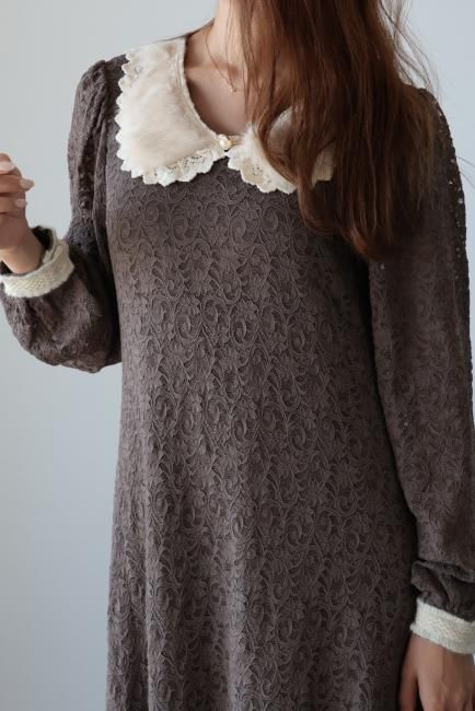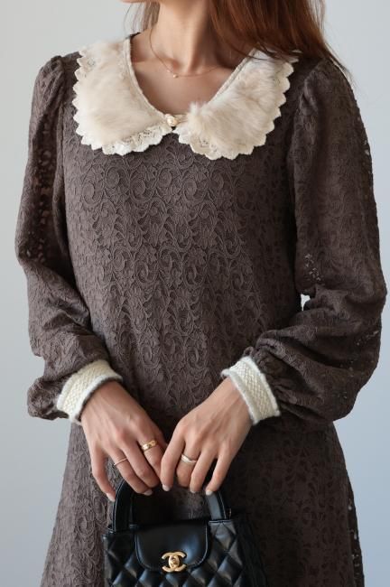 大きな襟にファーとレースがあしらわれたレトロなデザインがポイントになったAライン総レースワンピース。