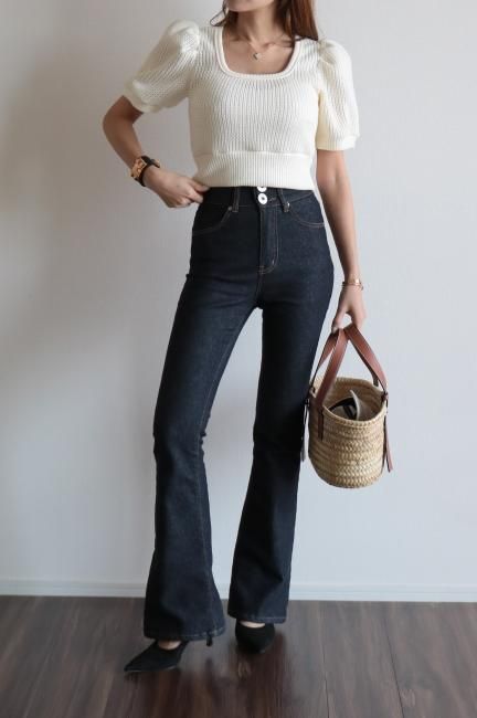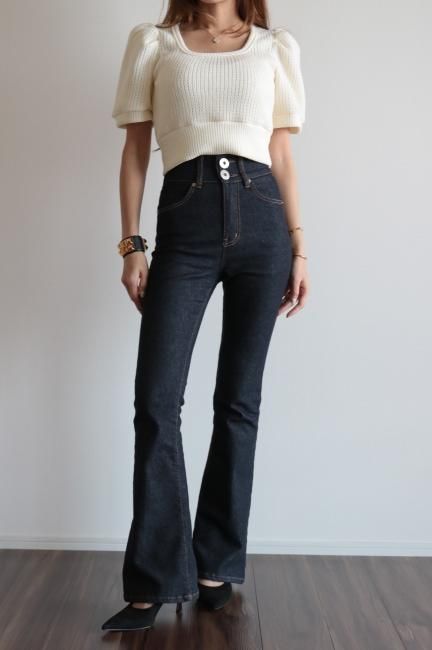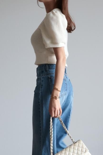 ハイウエストのボトムスとの相性がとても良く、デニムやスラックス、ワイドパンツやフレアスカートなど様々なジャンルのボトムスとバランス良く合わせていただけます。
