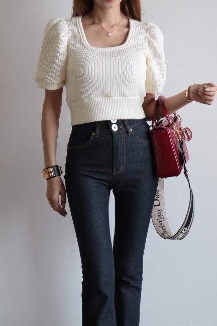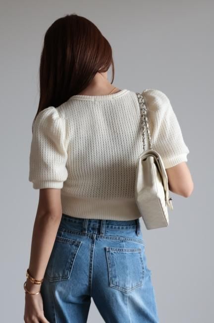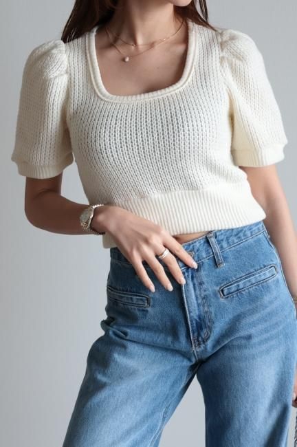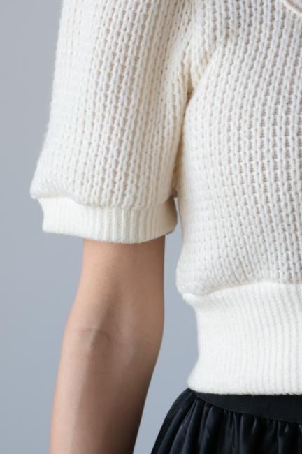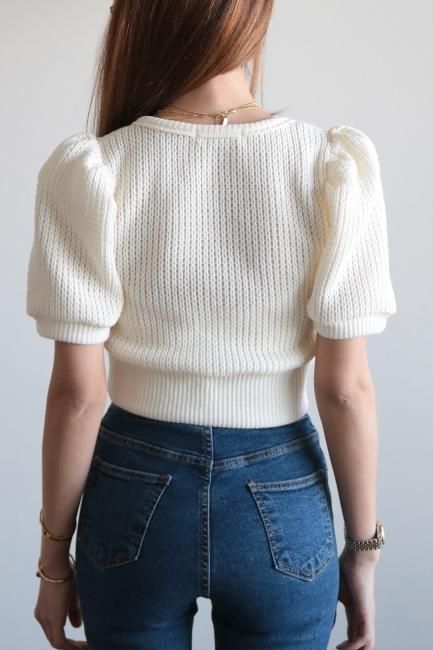 puff sleeve short rib knit tops / ivory