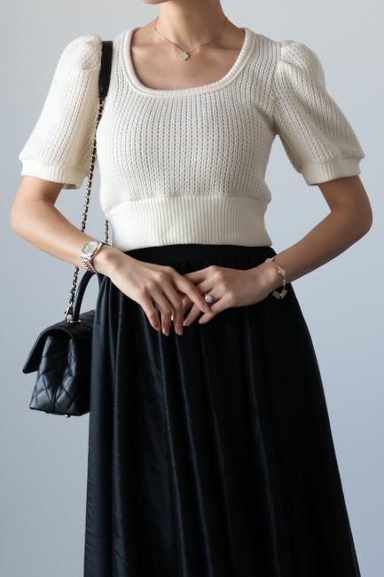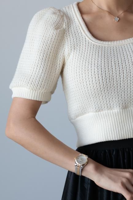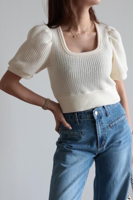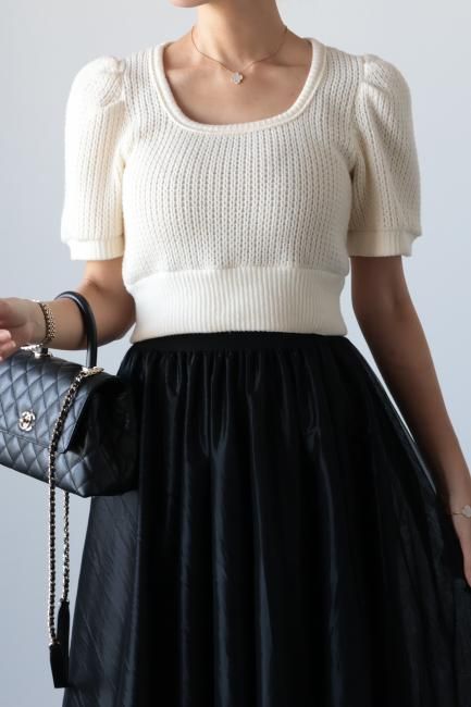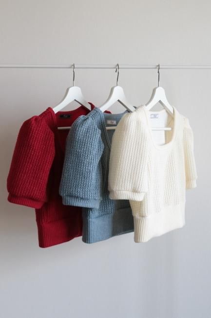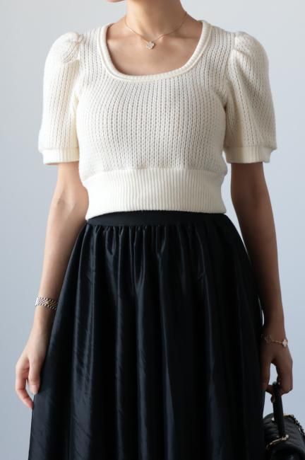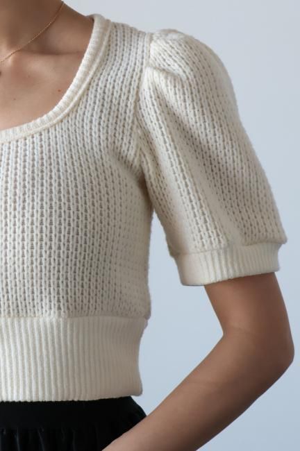 立体的なパフスリーブにスクエアネックがポイントになったショートニットtops。