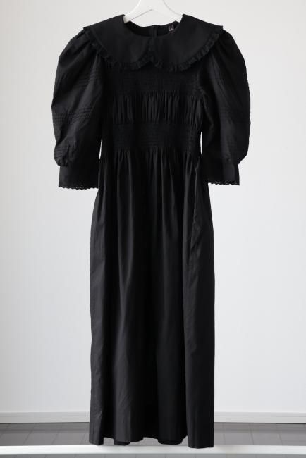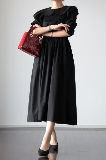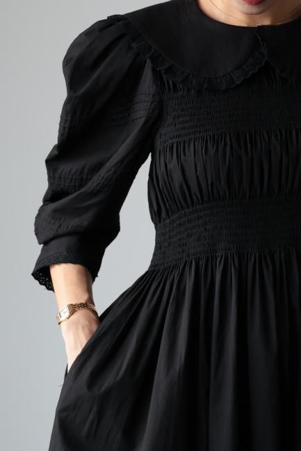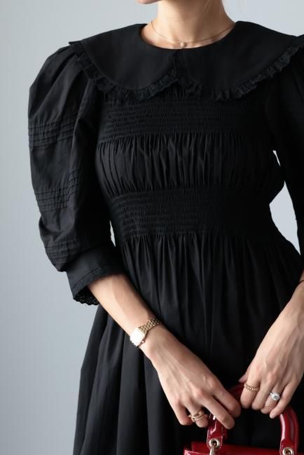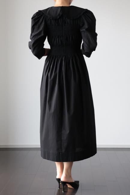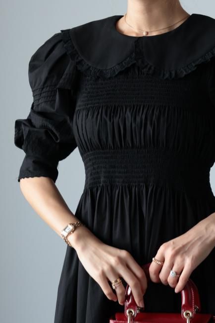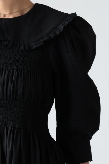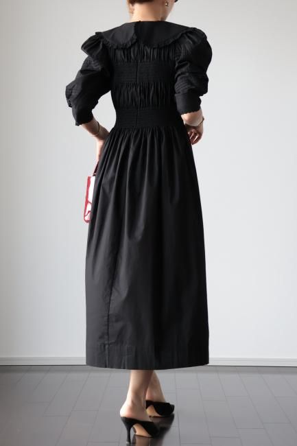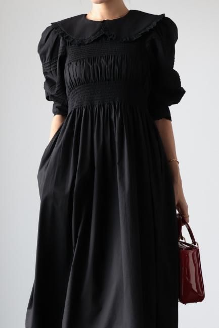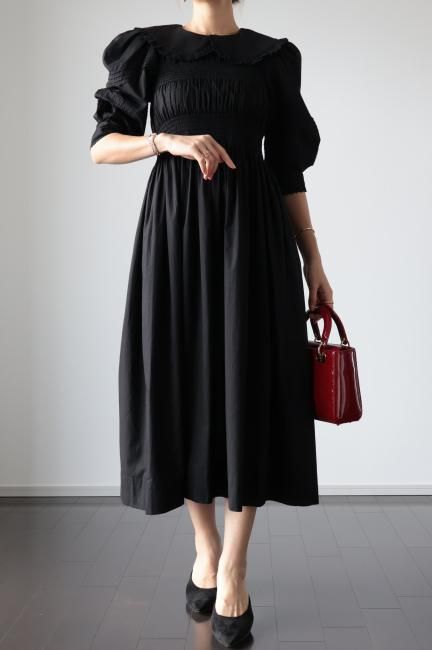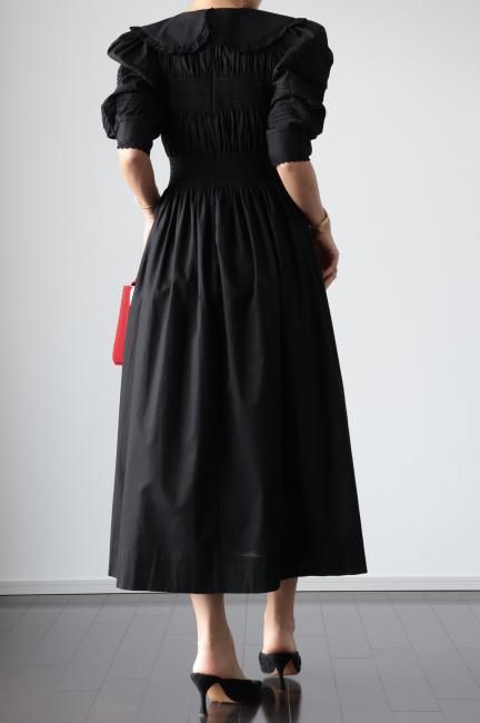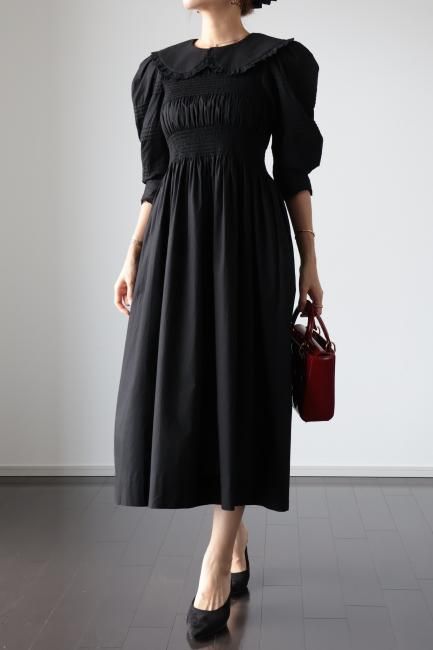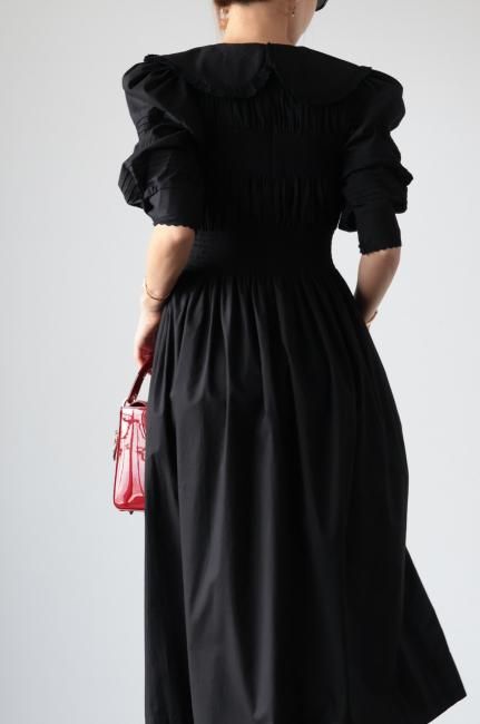 platter collar shirring flare dress / black