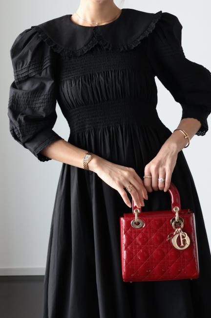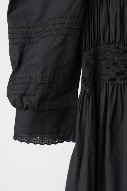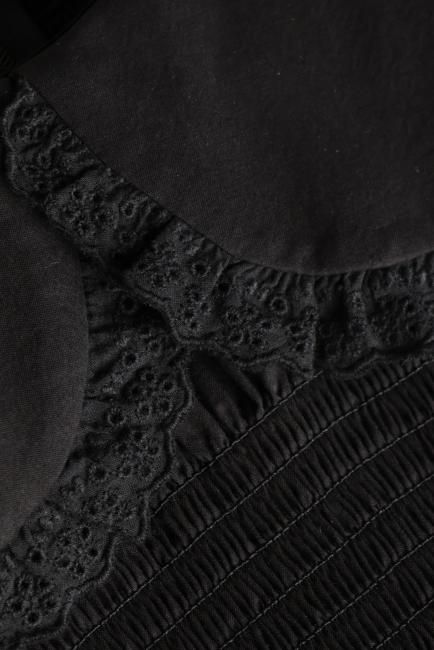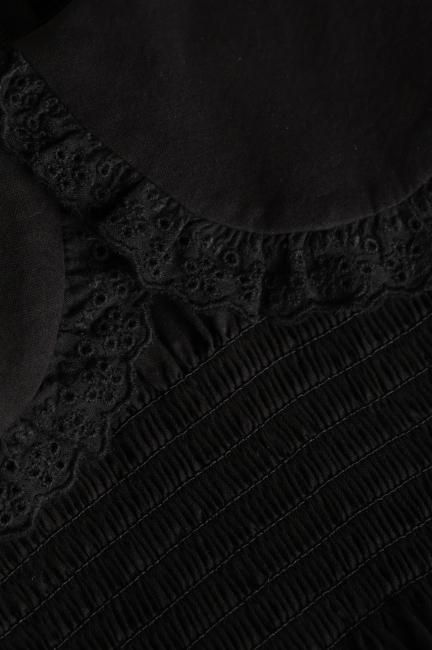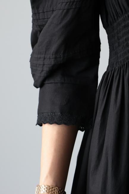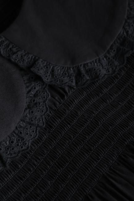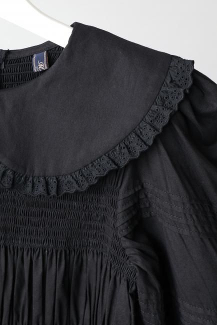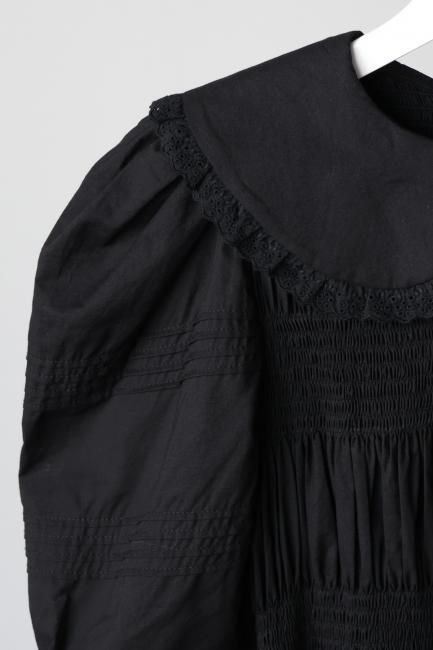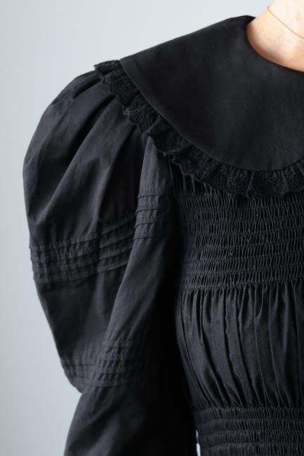 丸襟と、カフス部分にはレースが施されており、レトロかつモードな印象でお召しいただけます。