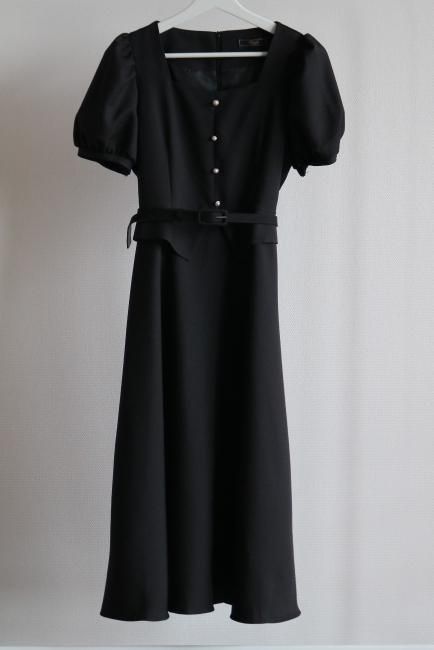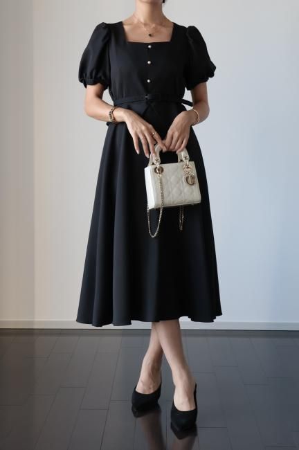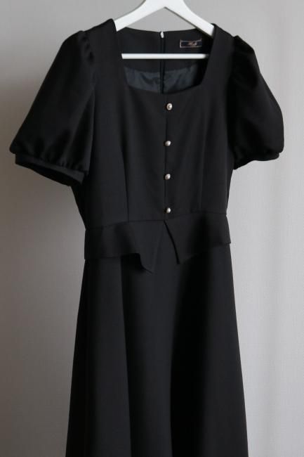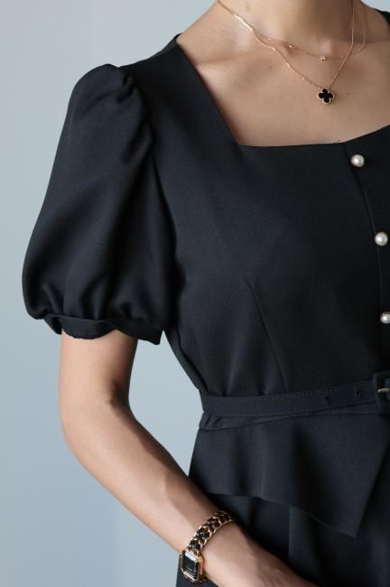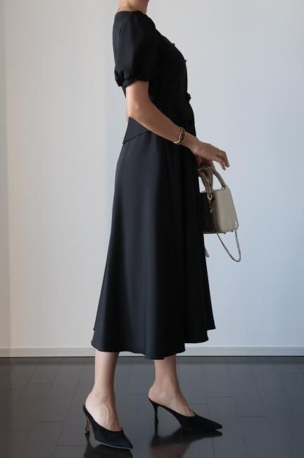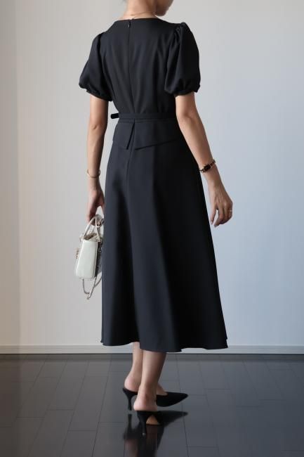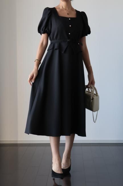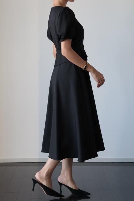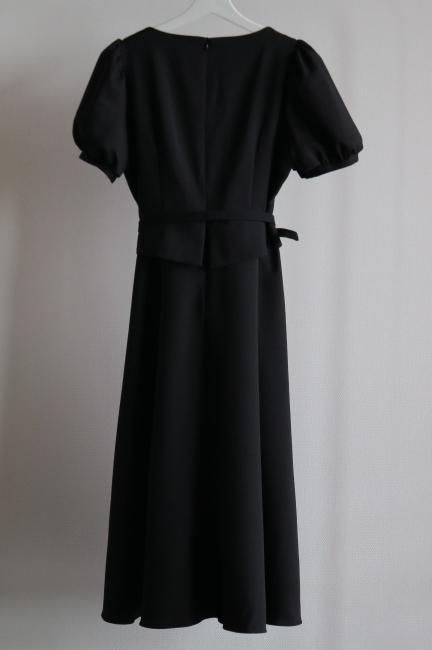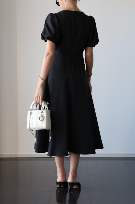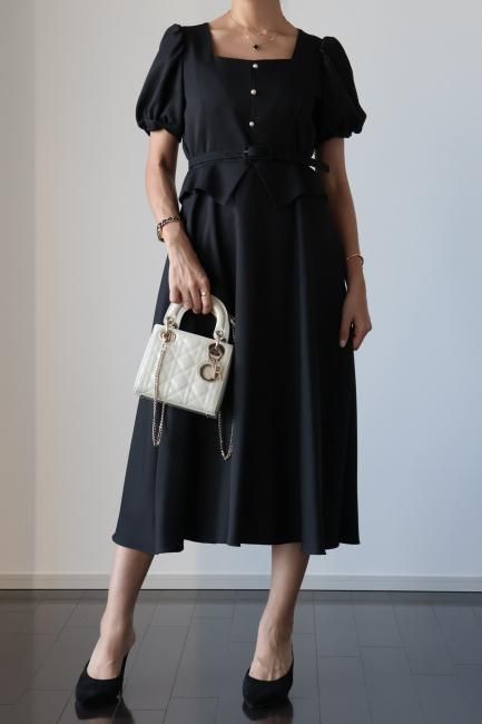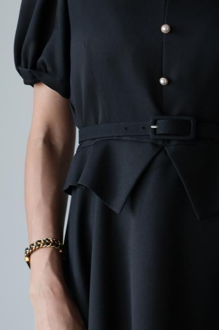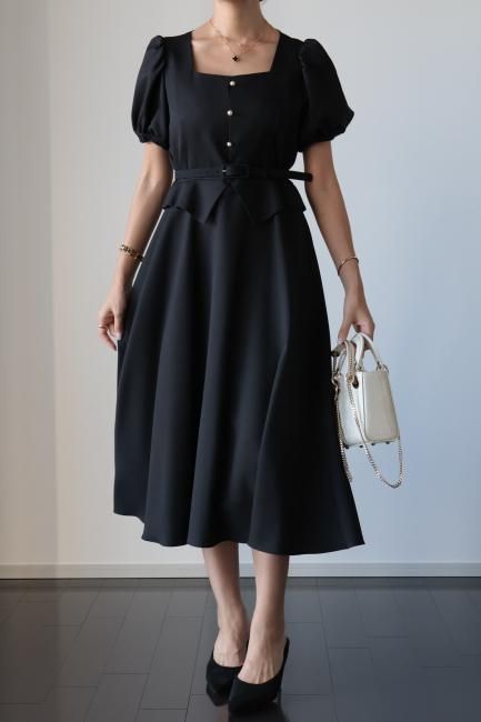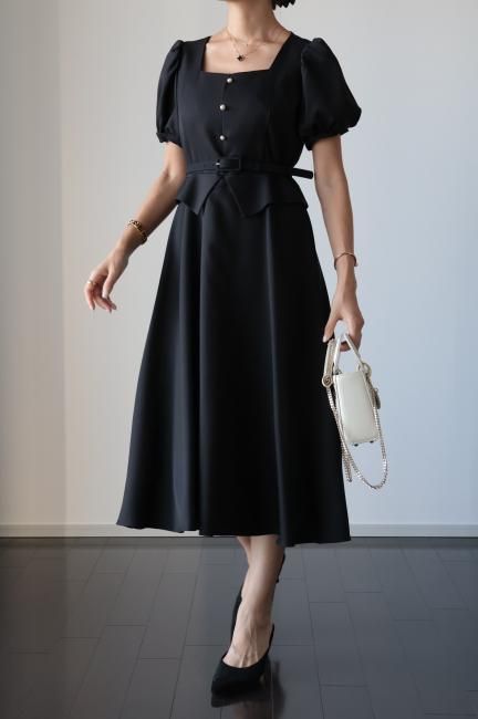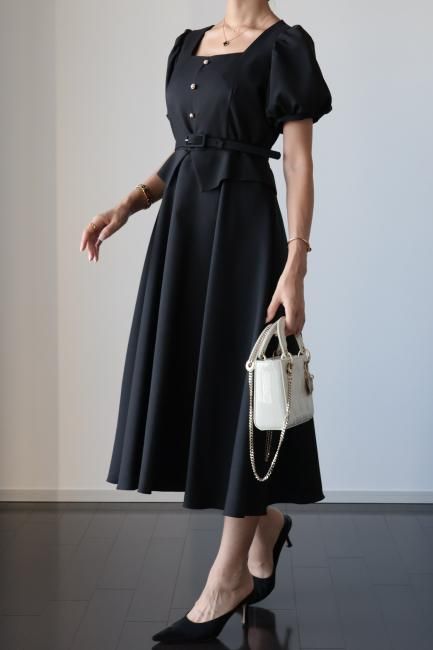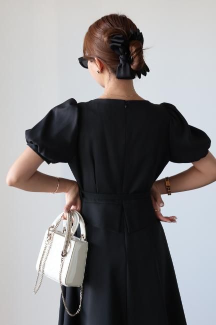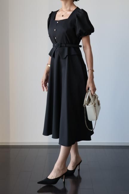 ペプラムがドッキングしたレトロな雰囲気漂うシックなパフスリーブドレス。