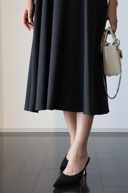 同色のウエストベルトでマークするとハイウエスト切り替えのペプラムがメリハリのあるラインを演出してくれ、とても美しいシルエットでお召しいただけます。