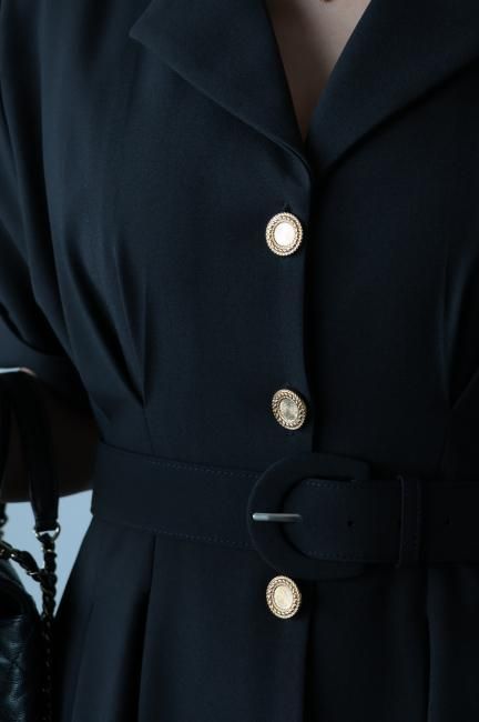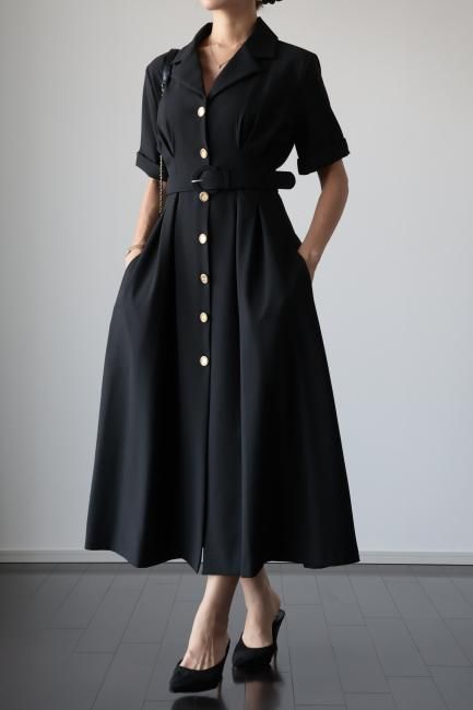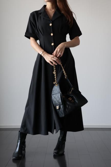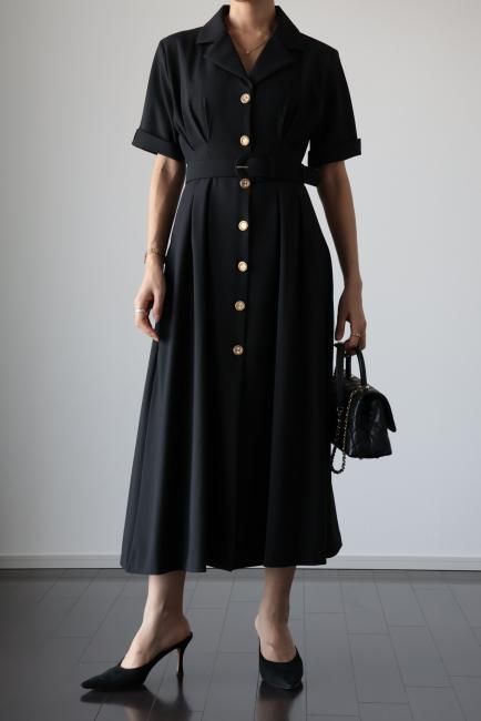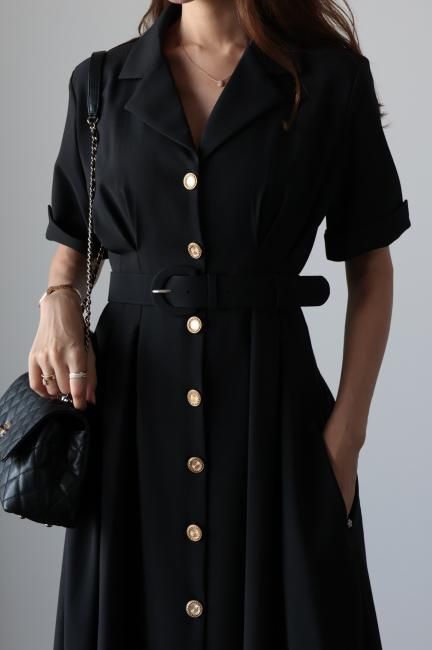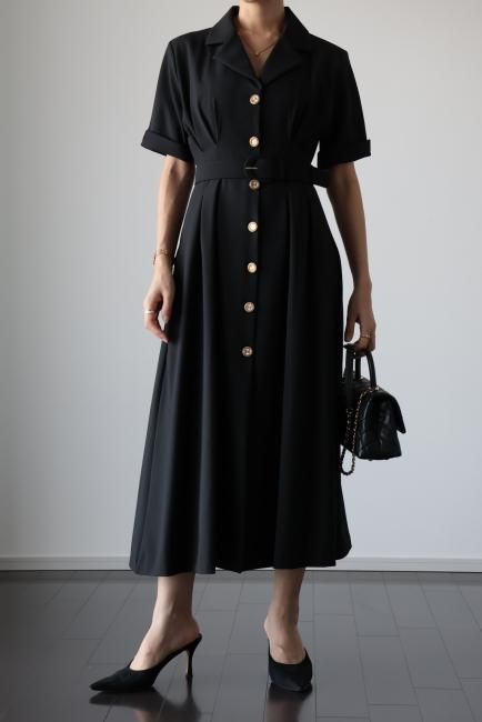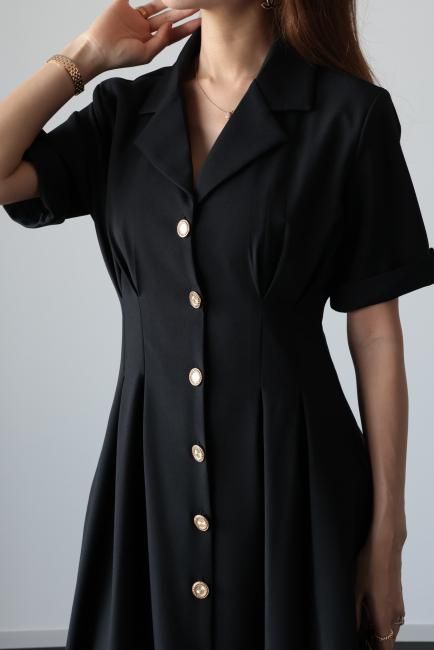 オープンカラーにvintage likeなゴールドボタンがポイントになったMadder vintageオリジナルAラインドレス。