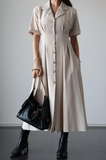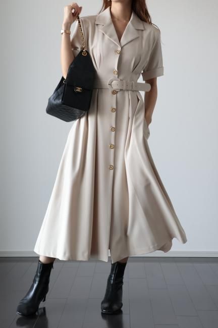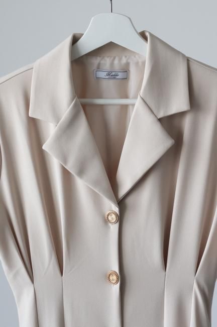 オープンカラーにvintage likeなゴールドボタンがポイントになったMadder vintageオリジナルAラインドレス。