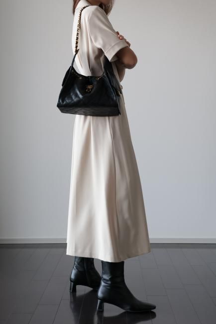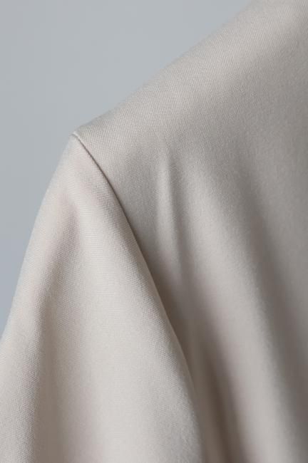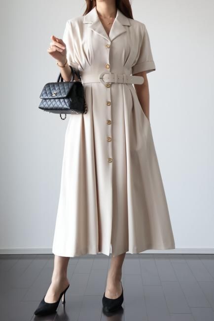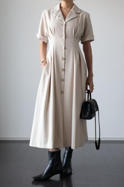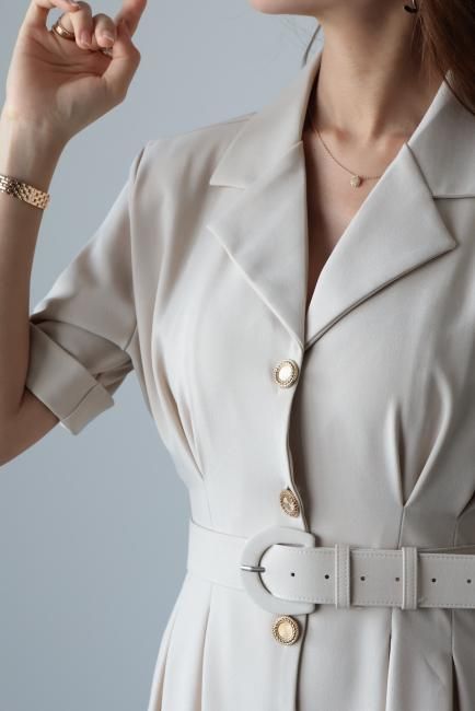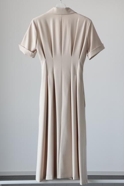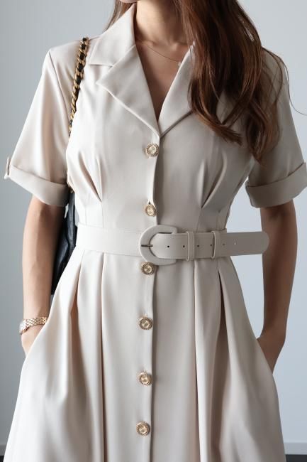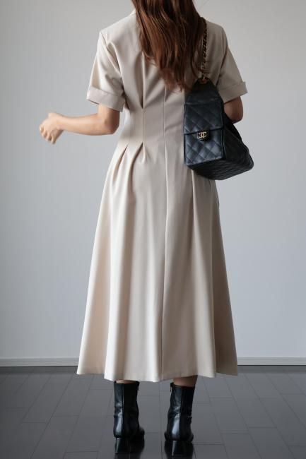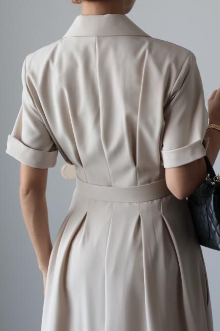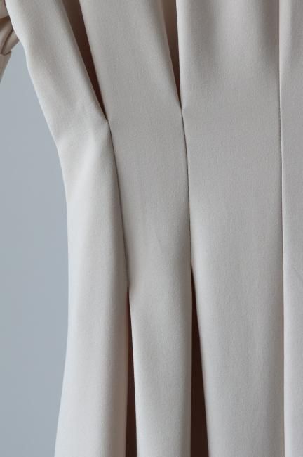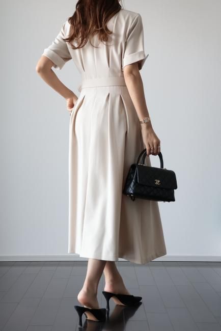 ウエストが綺麗に見えるよう 胸元とスカート部分にタックを施し、ベルトなしでもシルエットが美しく、また総裏地ですので、アイボリーでも透け感の心配はなくお召しいただけます。