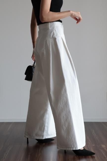 サイドのタックデザインがポイントになった スーパーワイドデニムパンツ。