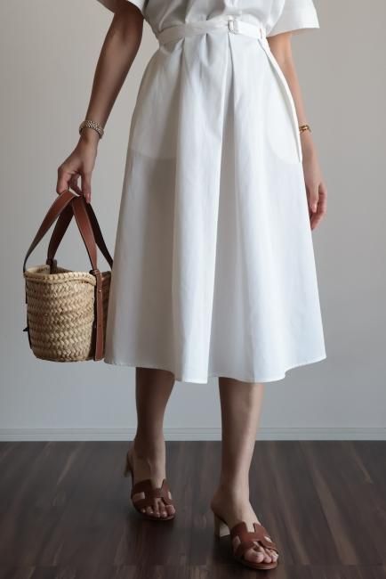 ハイウエスト切り替えになっており、 後ろのみゴムが通っておりますので、 ボックスプリーツのシルエットを崩すことなく 綺麗やシルエットを演出してくれます。