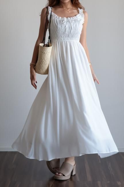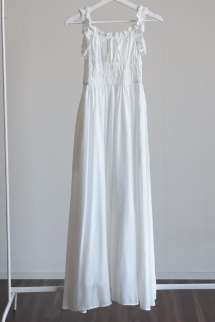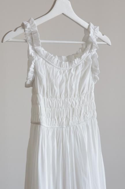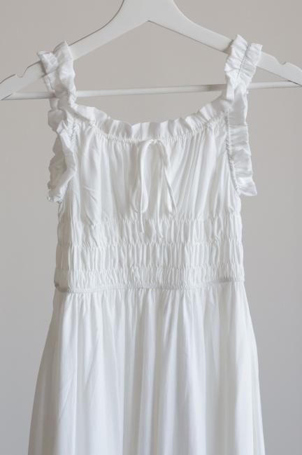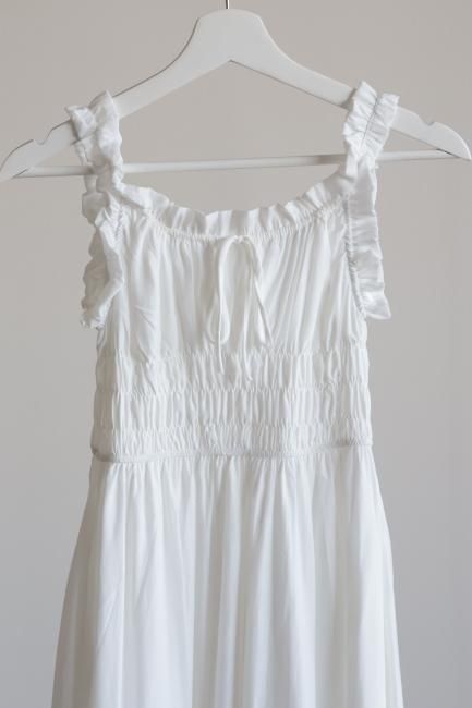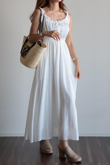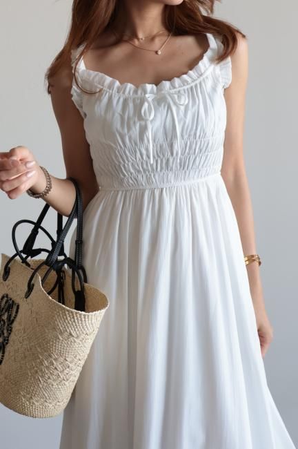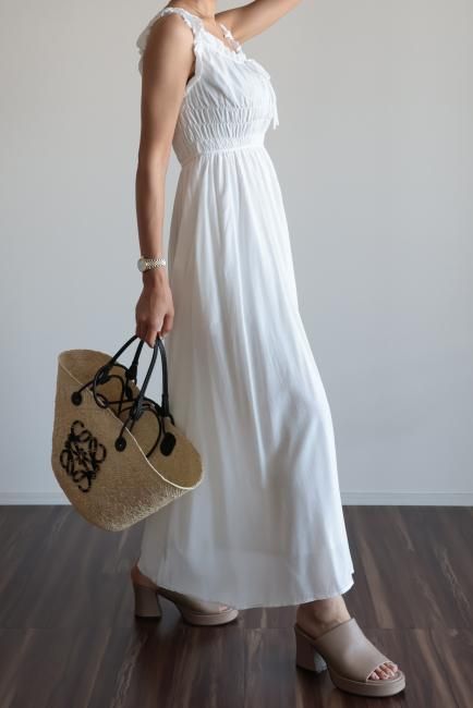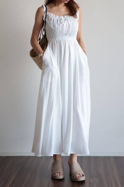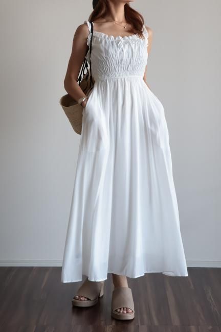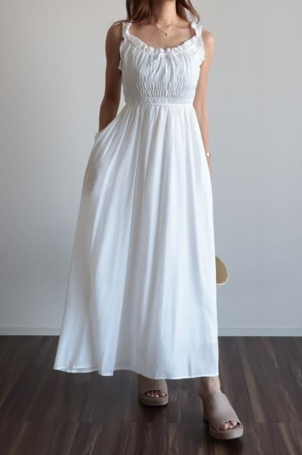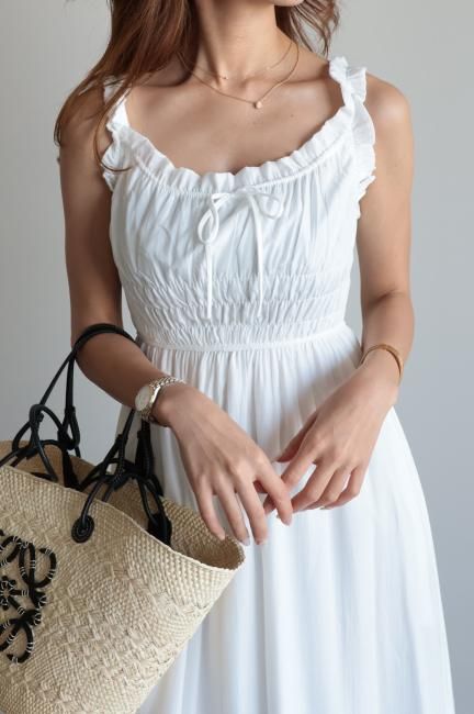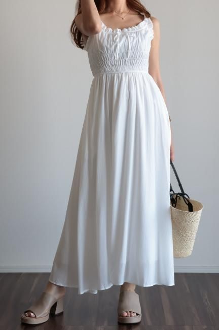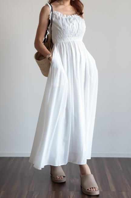 フリルと小さなリボンがポイントになったシャーリングロングドレス。