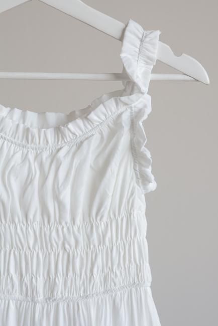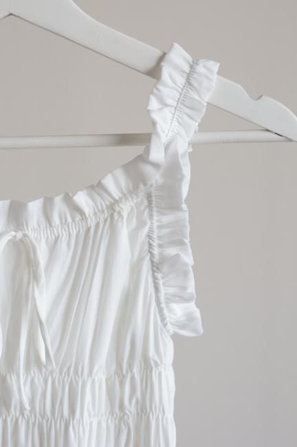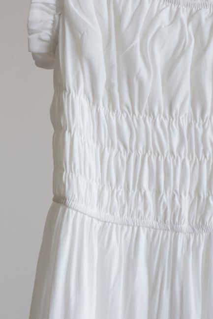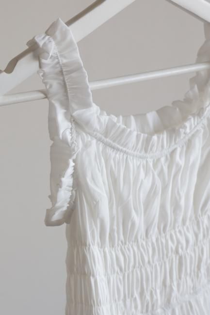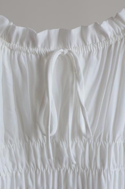 トップのシャーリング部分のみならず、フリルショルダー部分にもゴムが通っており、オフショルのように着崩すのもおすすめ。