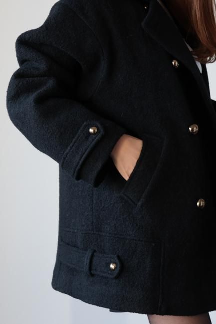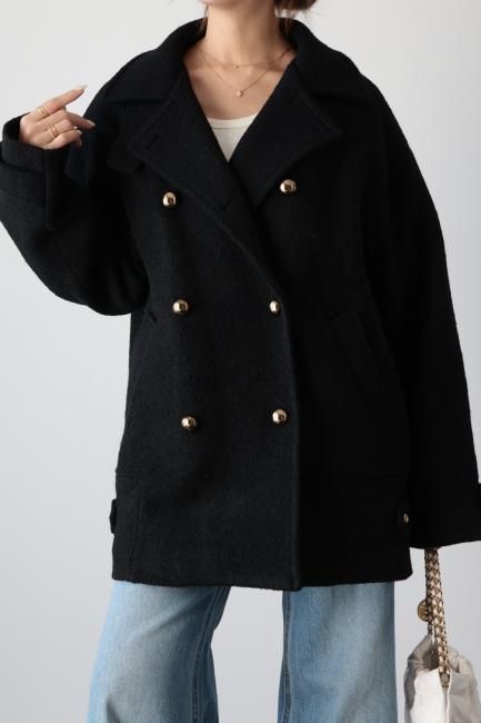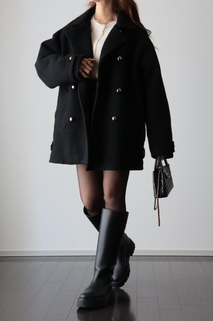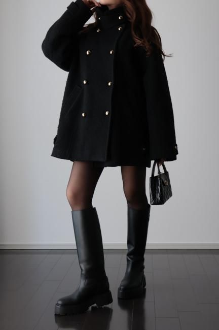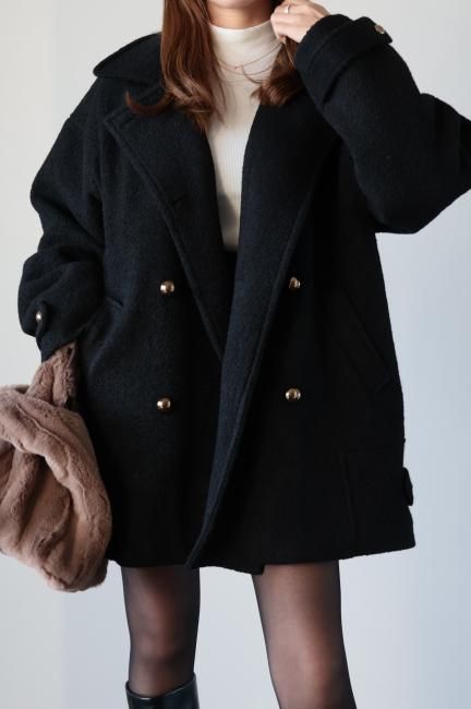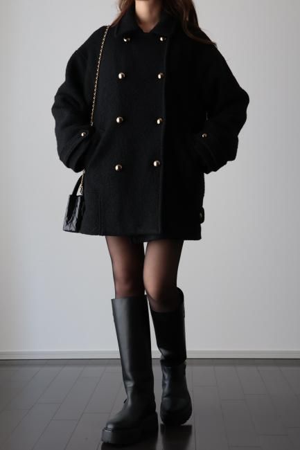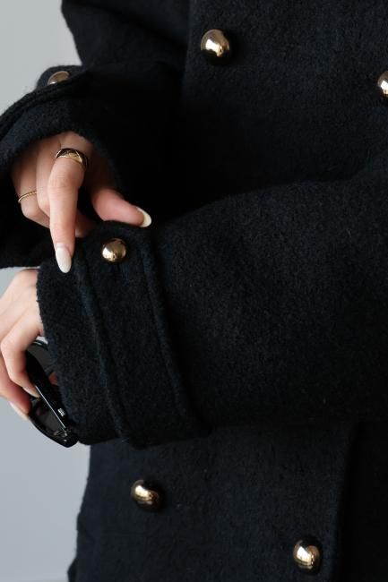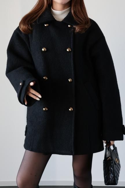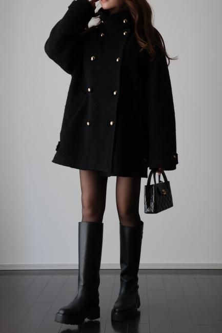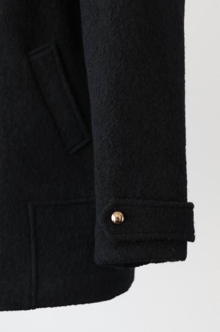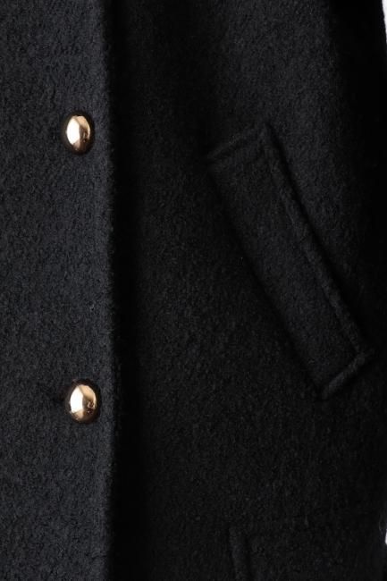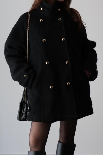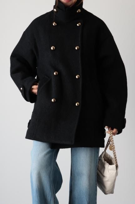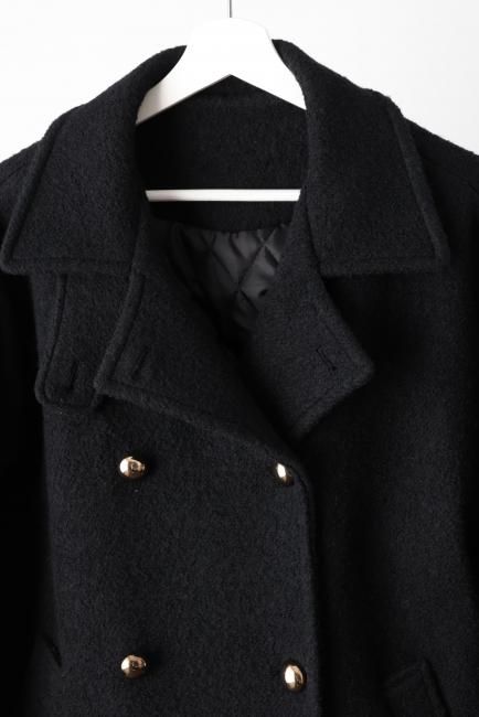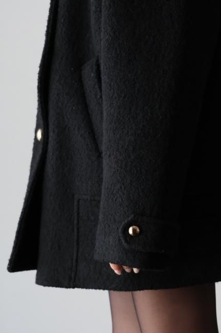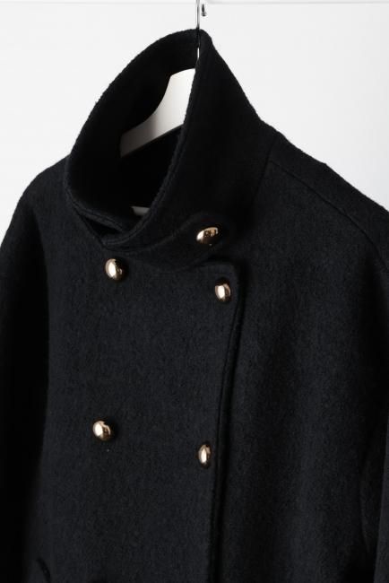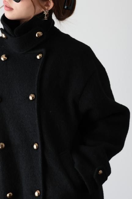 ゴールドボタンがポイントになった コンバーチブルカラーウールミディコート。