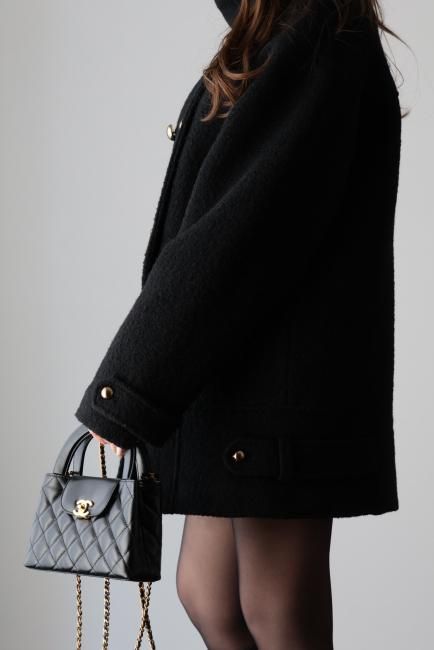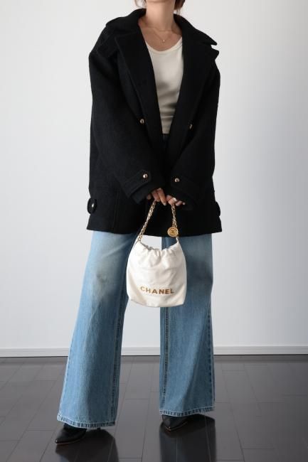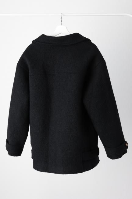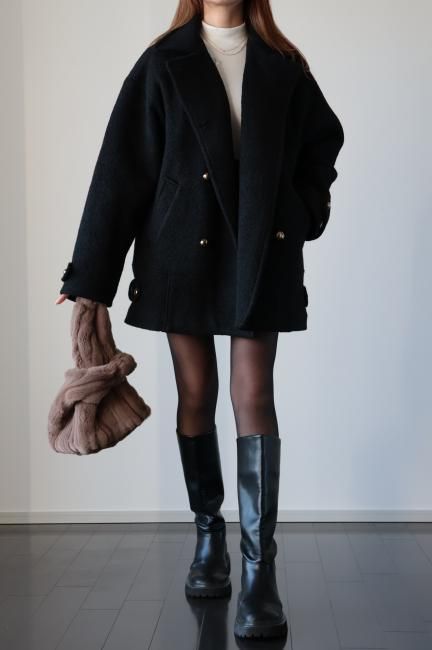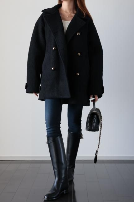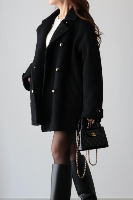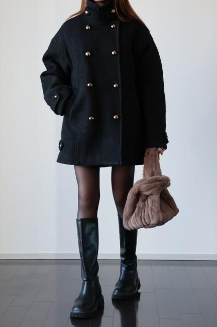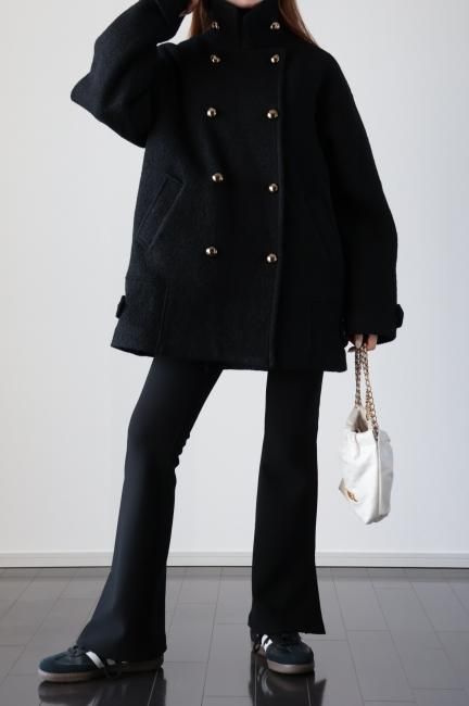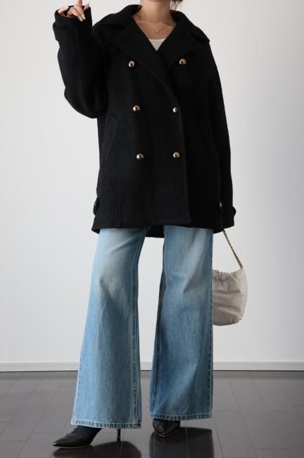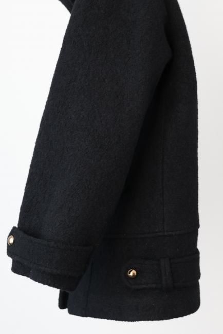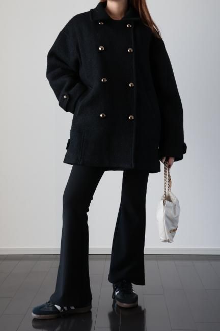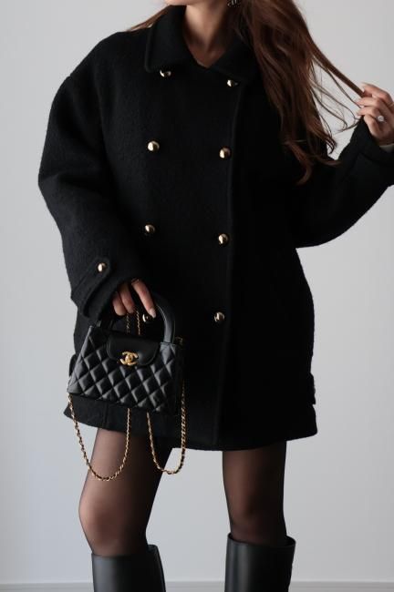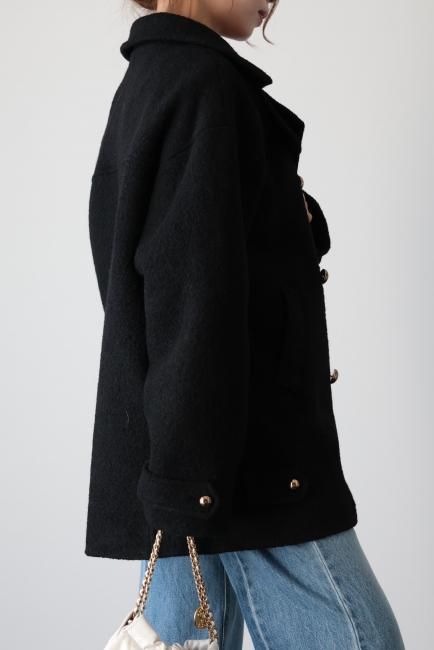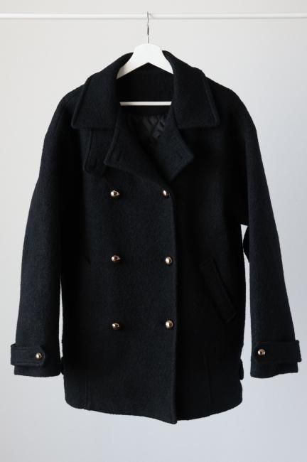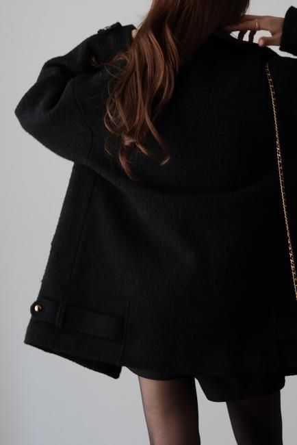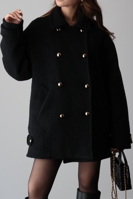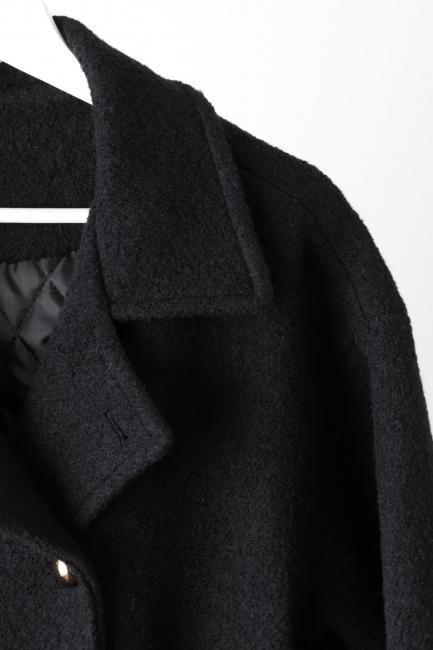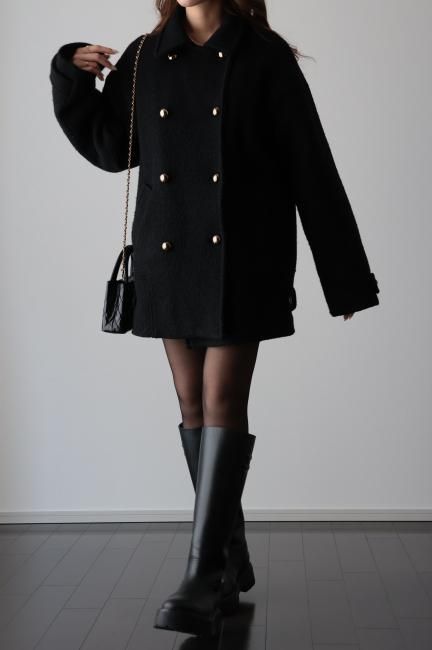 ゴールドボタンがポイントになった コンバーチブルカラーウールミディコート。
