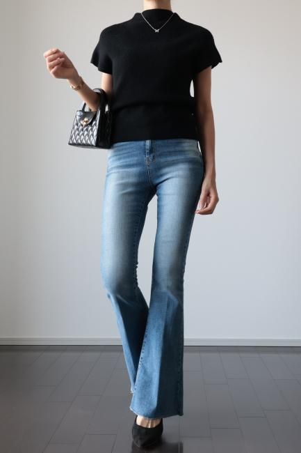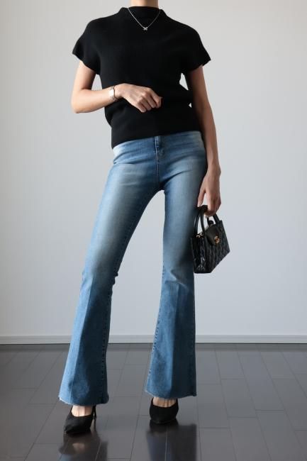 cut off high waist stretch flare denim pants / blue