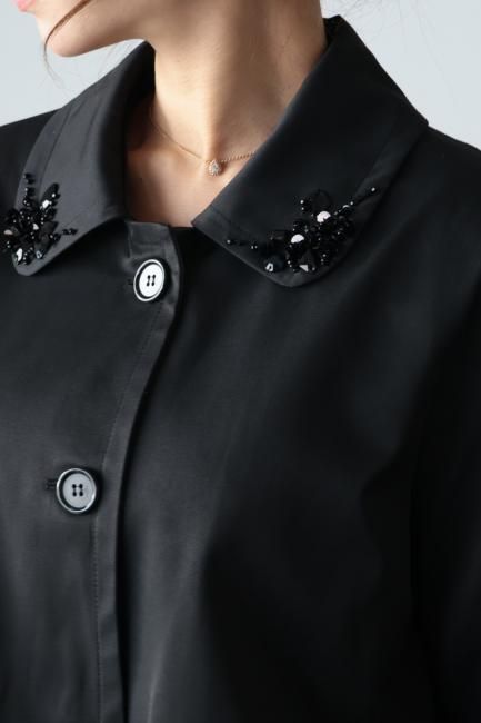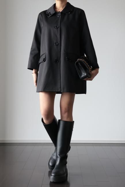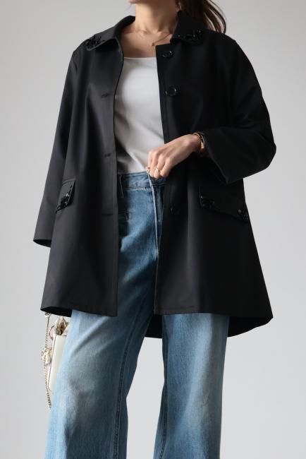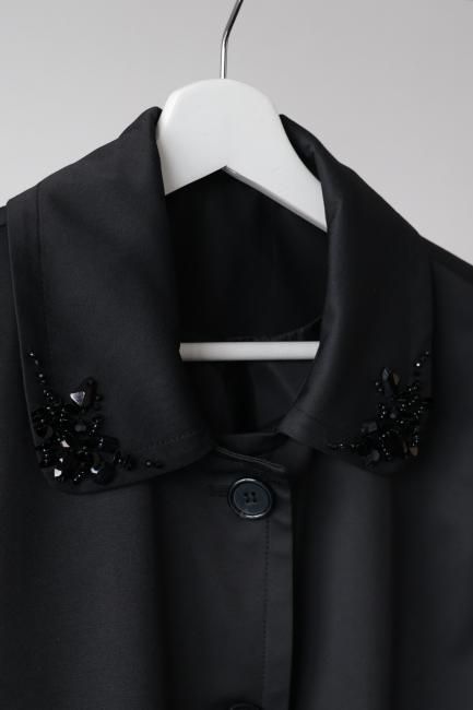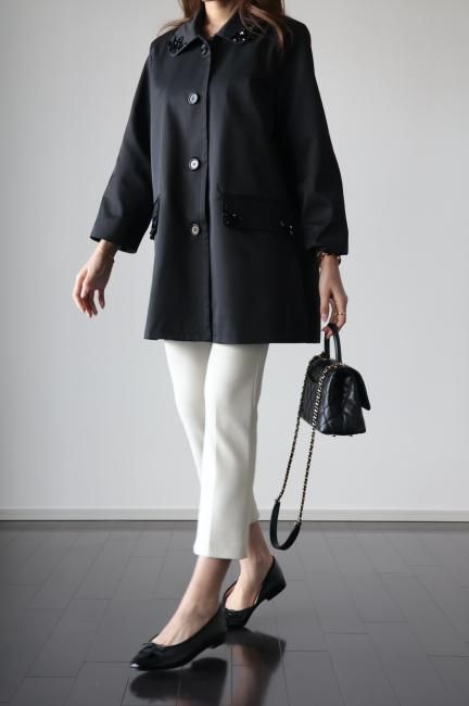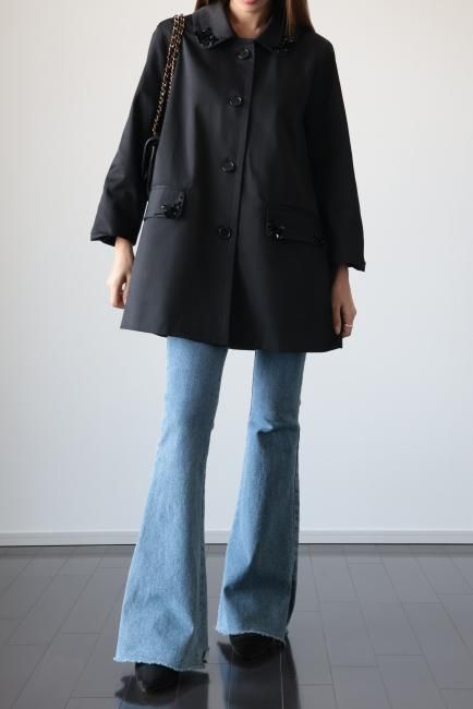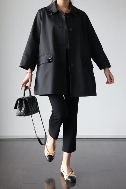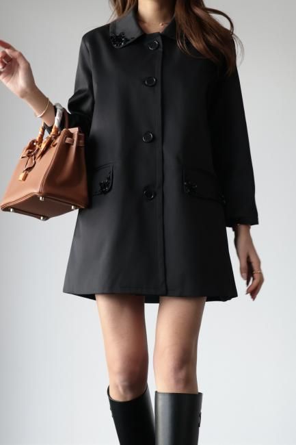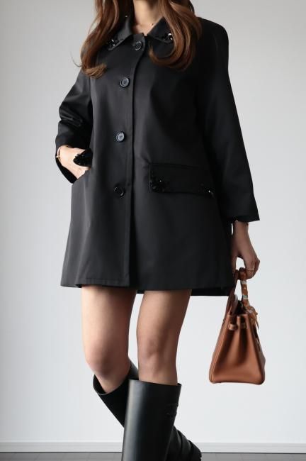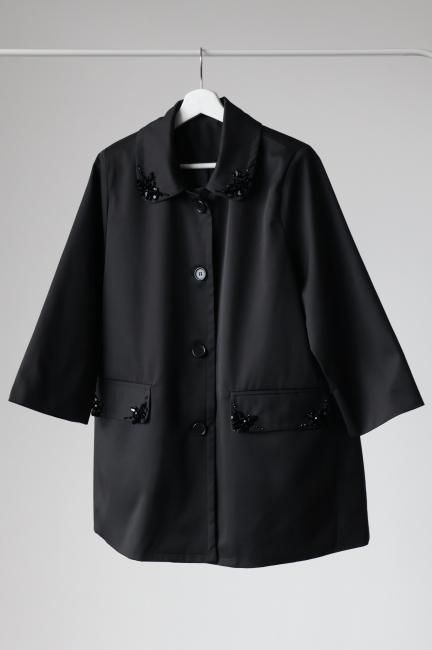 襟元とポケットにあしらわれたビジューがポイントになった レトロ雰囲気を演出してくれるAラインミディコート。