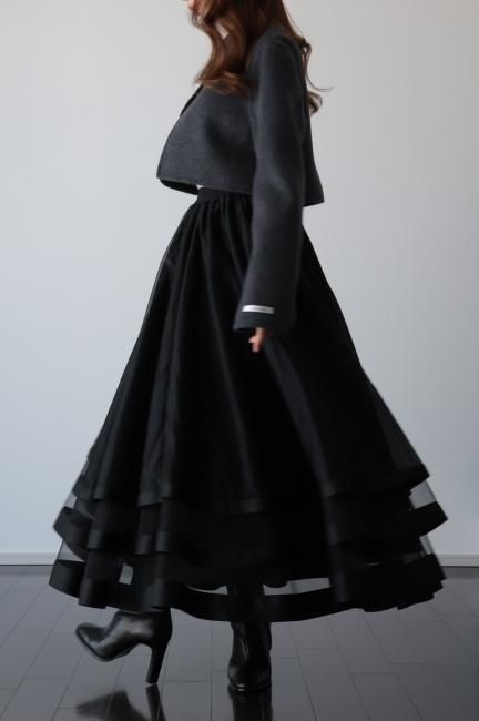 ティアードの様に3枚異なる長さのチュール生地は一枚目は軽さのあるフワッとした質感のチュールを採用。