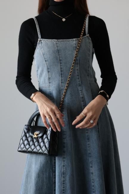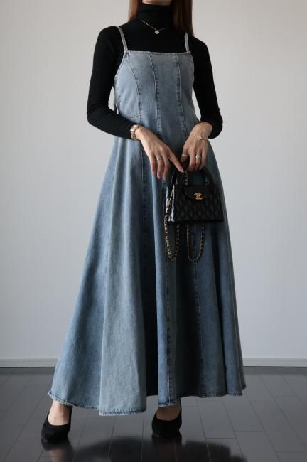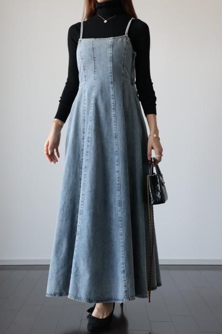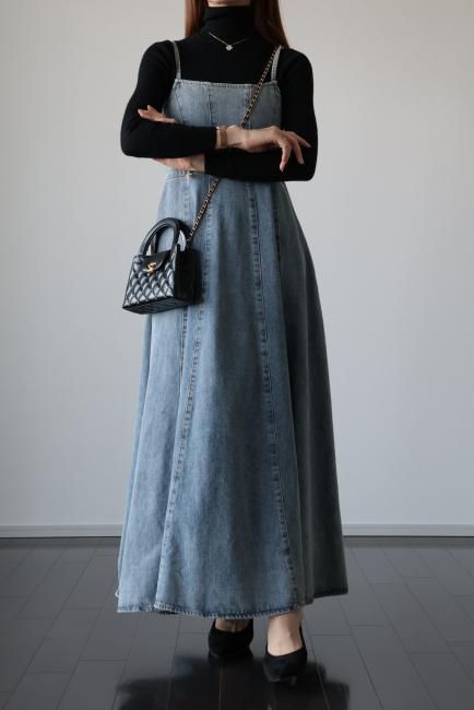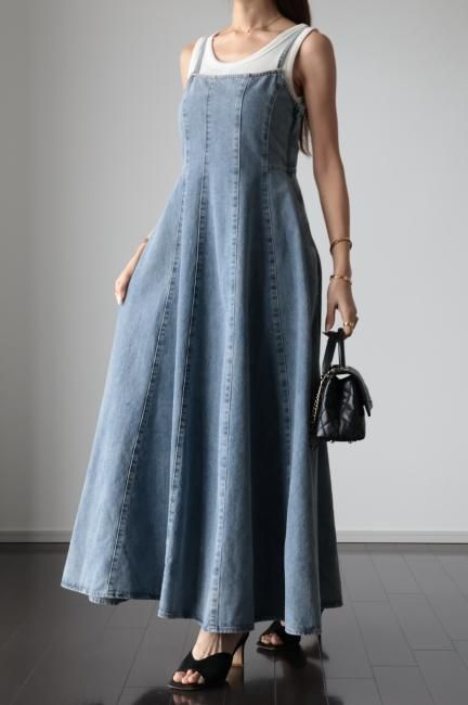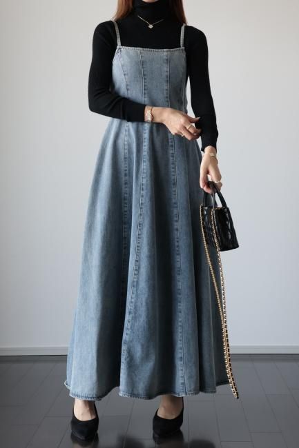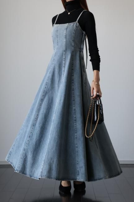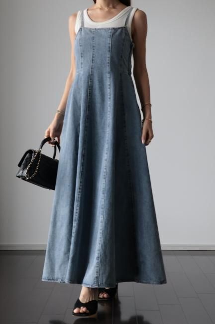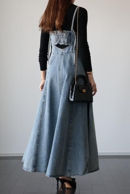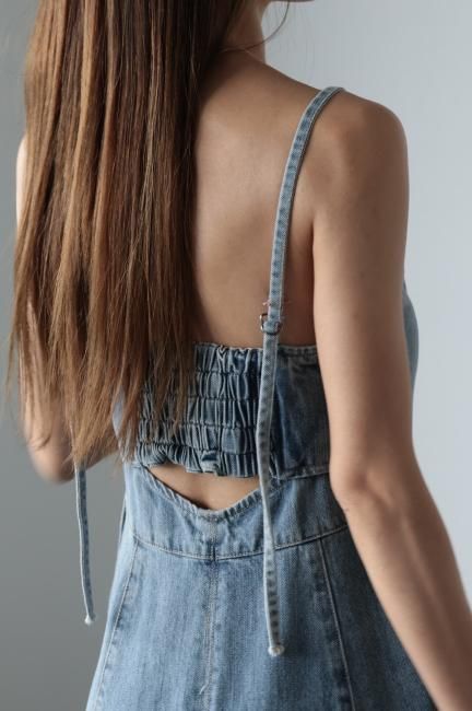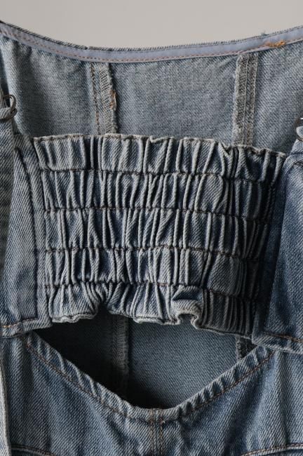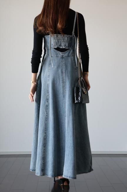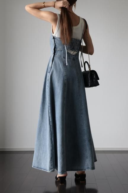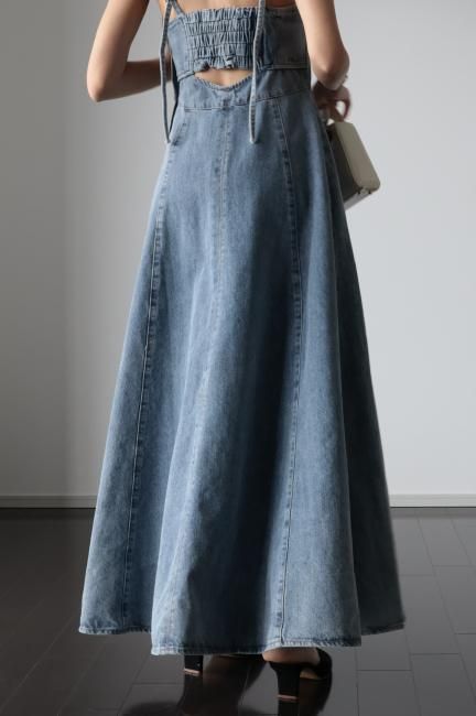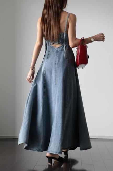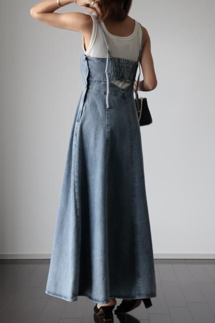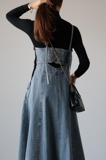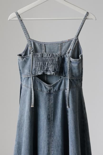 後ろのシャーリングデザインにトライアルカットがポイントになったボリュームデニムワンピース。