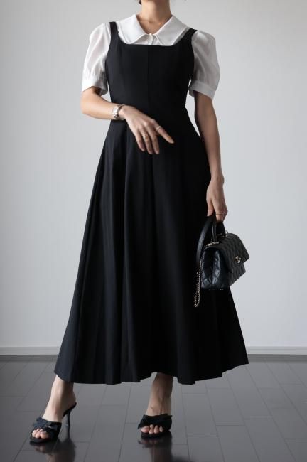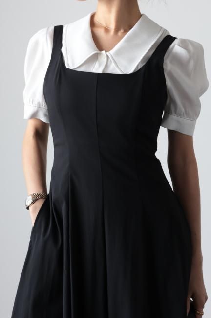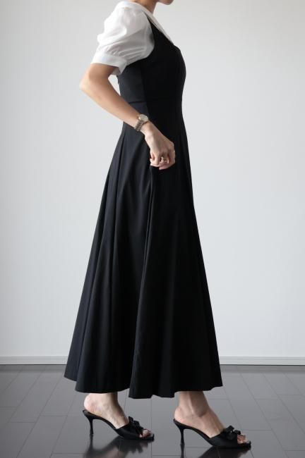 絶妙なスクエアネックのラインがデコルテを綺麗に魅せてくれ、ハイウエスト位置から広がるフレアなシルエットがレトロかつ上品な雰囲気を演出してくれます。