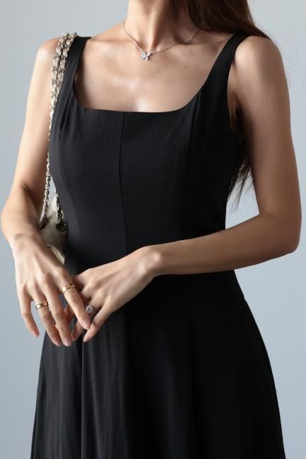 8枚のパネルから構成された美しいシルエットがポイントのスクエアネックロングドレス。