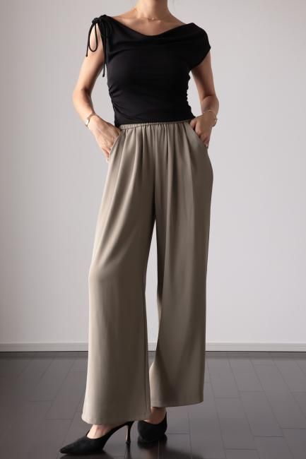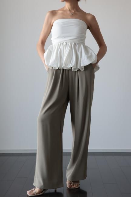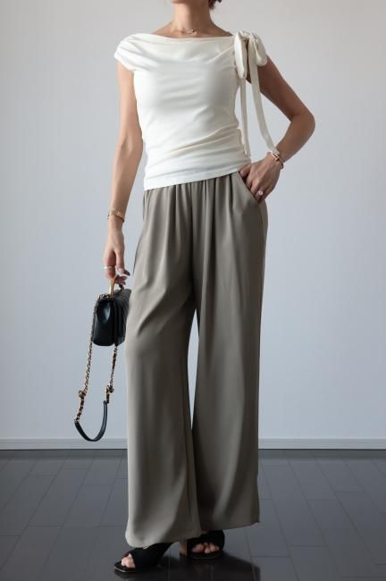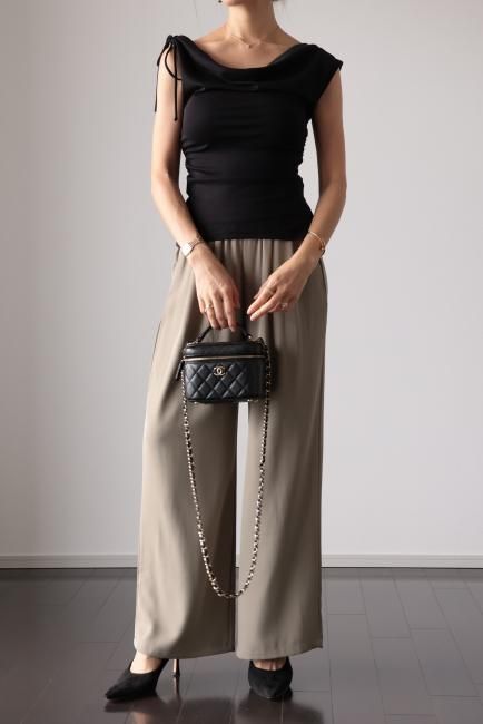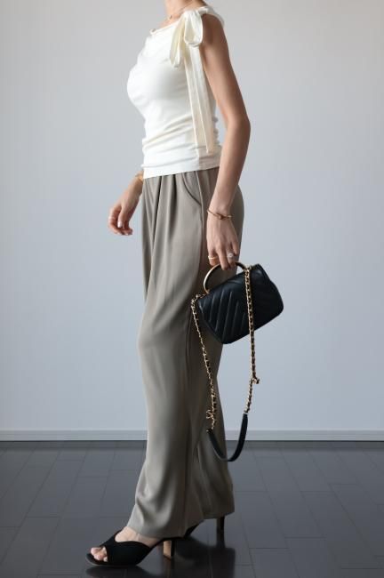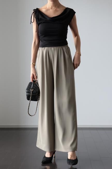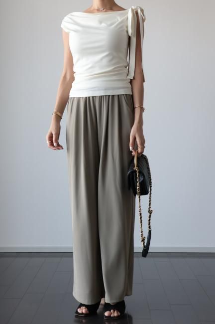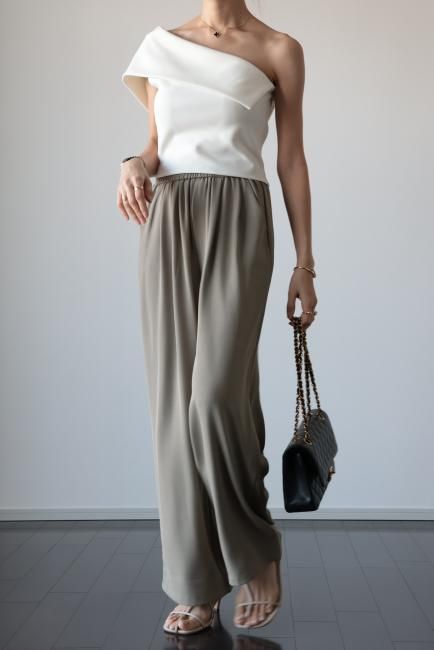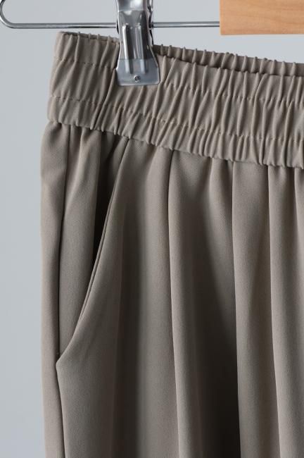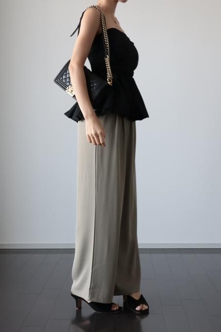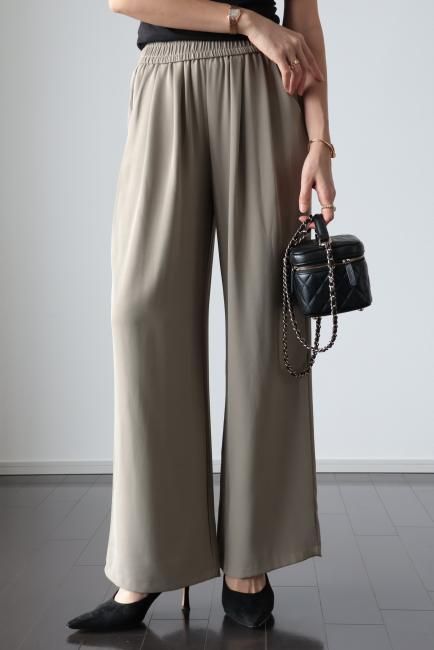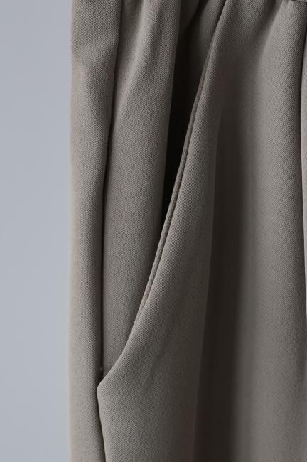 ワイドストレートなシルエットで脚のラインを拾わず、ウエストには太めに取られたゴムが入っており、しっかりとホールドしてくれます。
