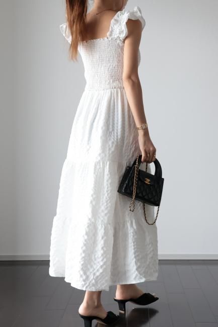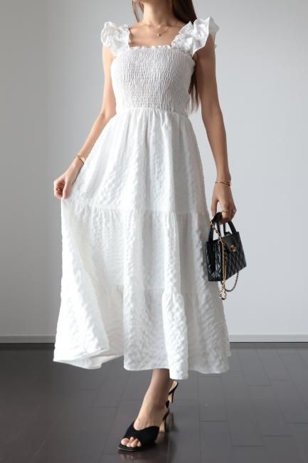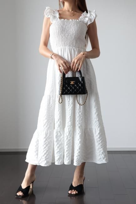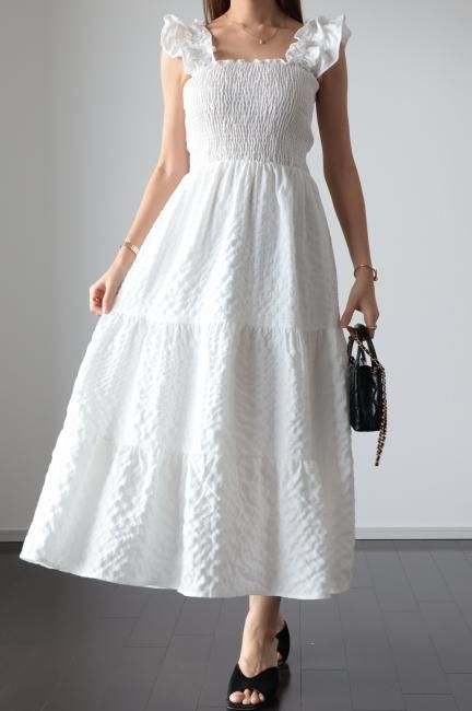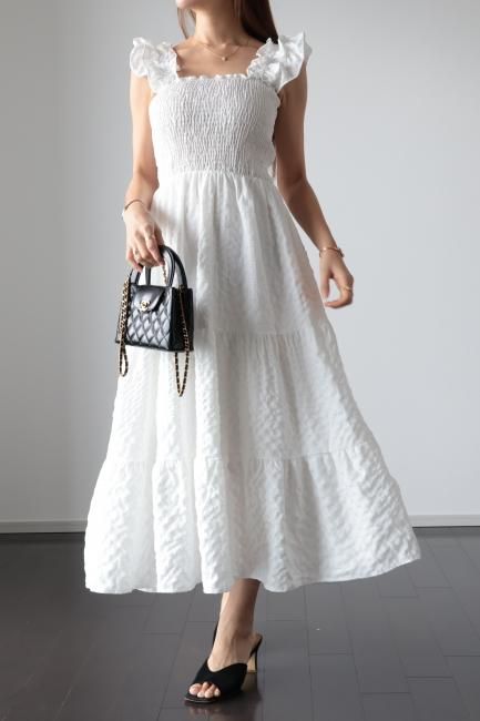 ショルダーのダブルフリルがポイントになったチェック柄シャーリングティアードワンピース。
