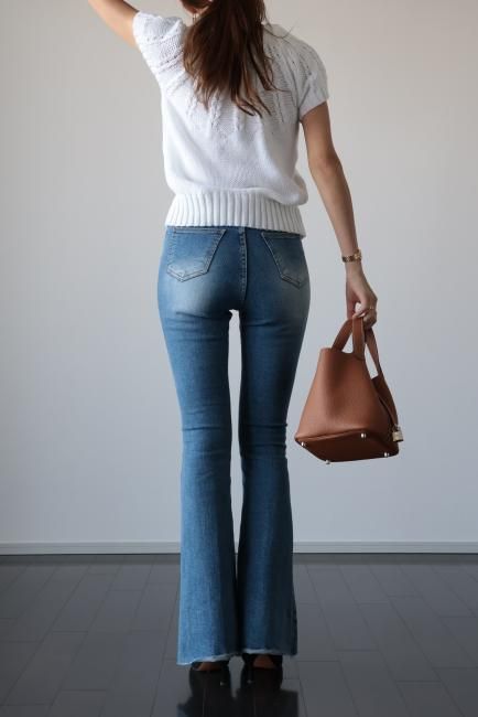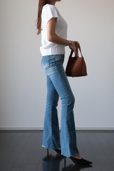 cut off high waist stretch flare denim pants / blue