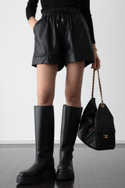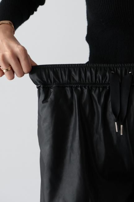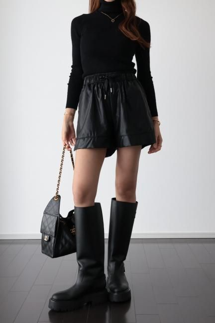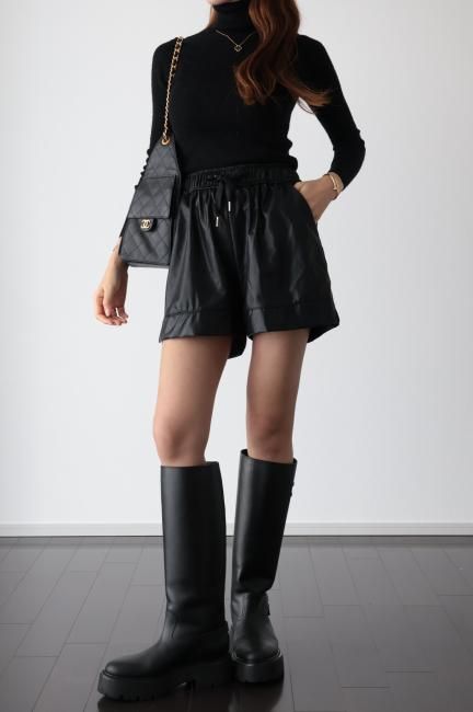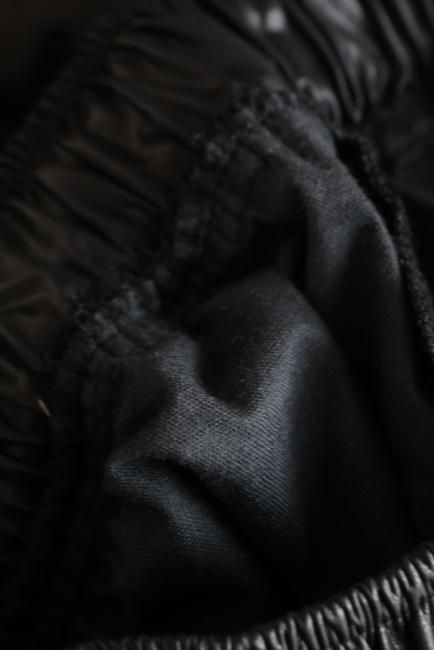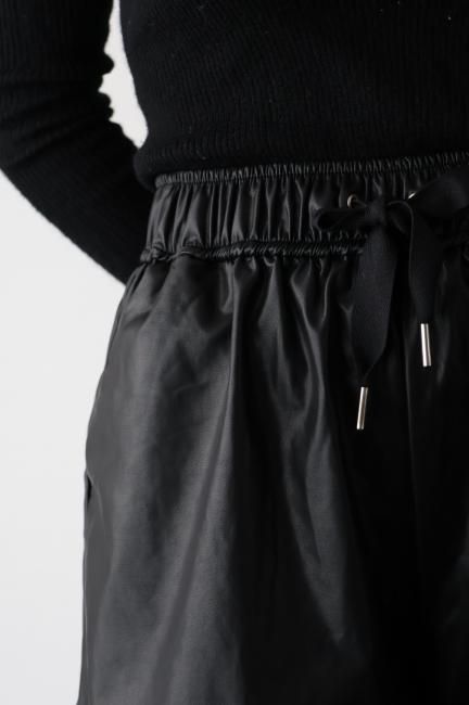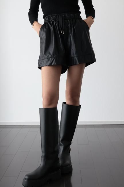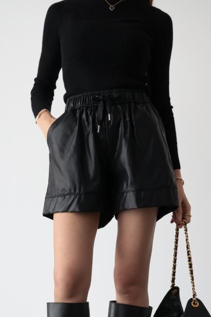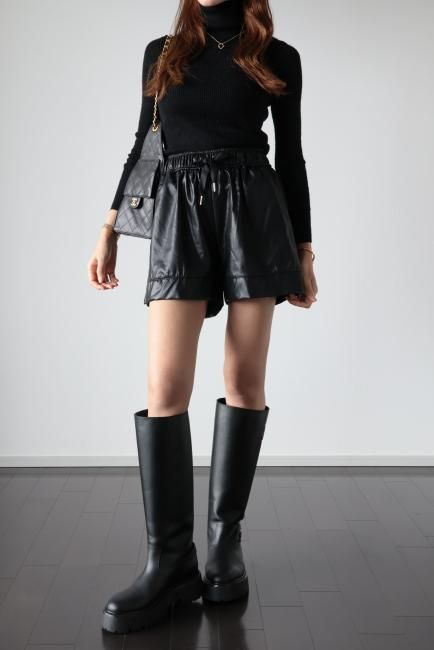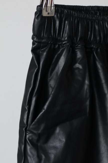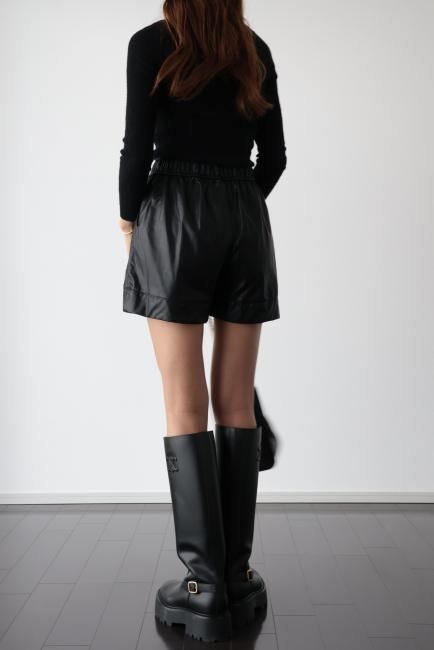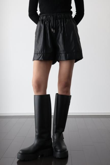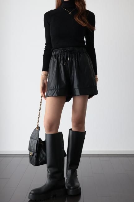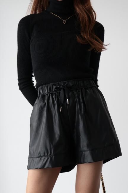ウエストのギャザーがポイントになったエコレザーショートパンツ。
