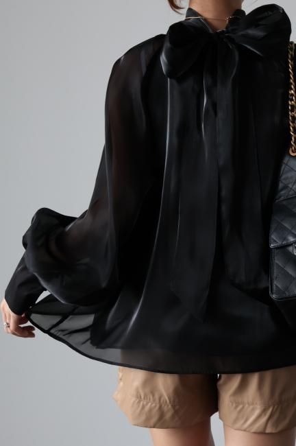大きなリボンタイがポイントになった前後どちらでもお召しいただける2wayオーガンジーリボンブラウス。