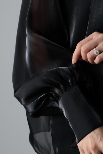 ハリと光沢のあるオーガンジー素材を使用した上品な印象でお召しいただけるレディな一枚。