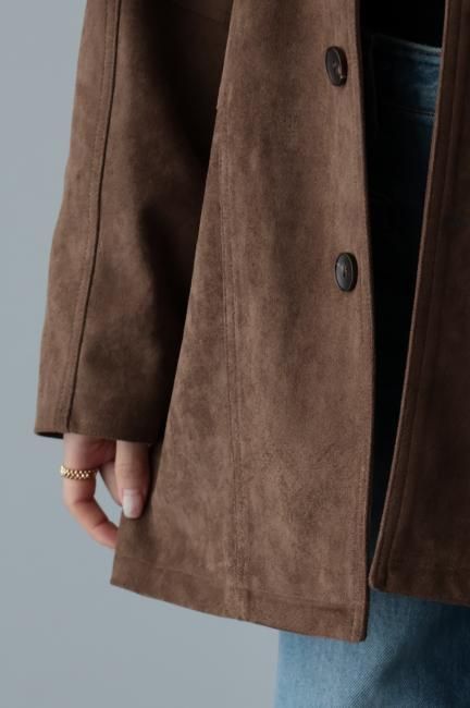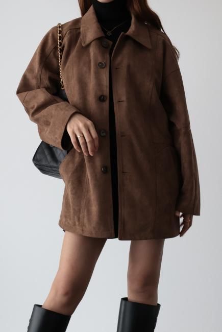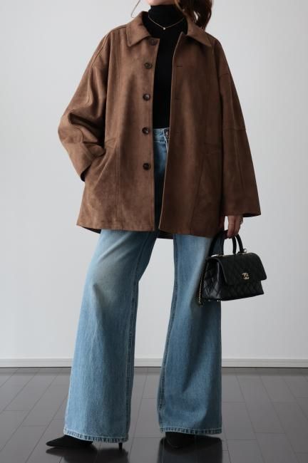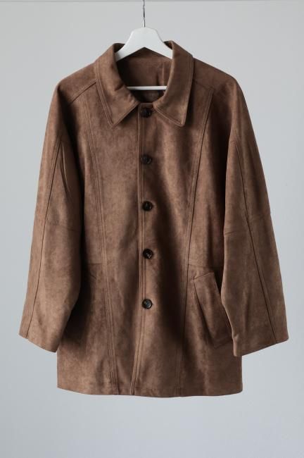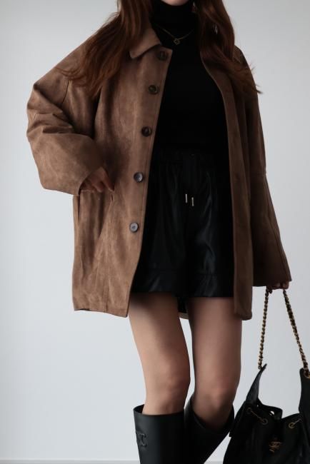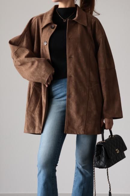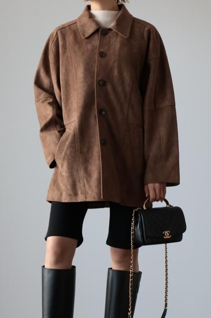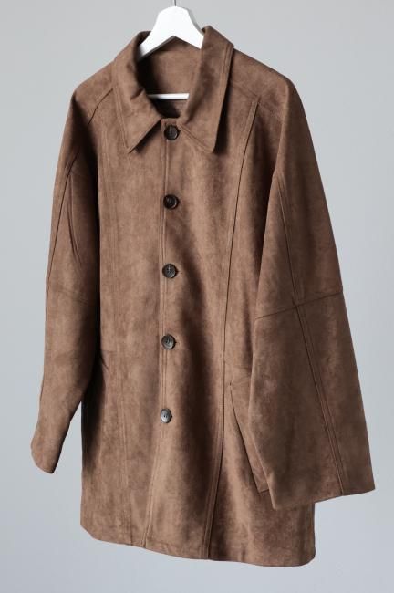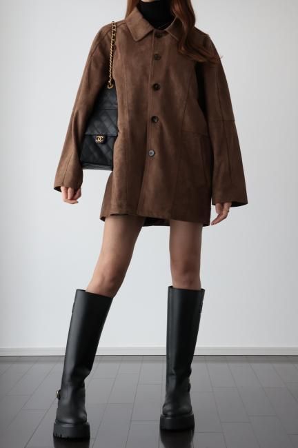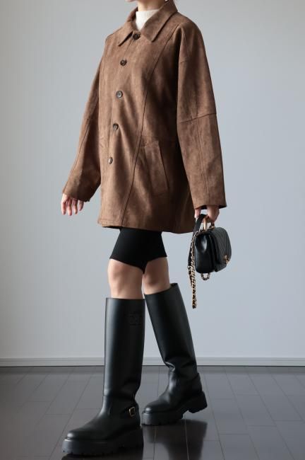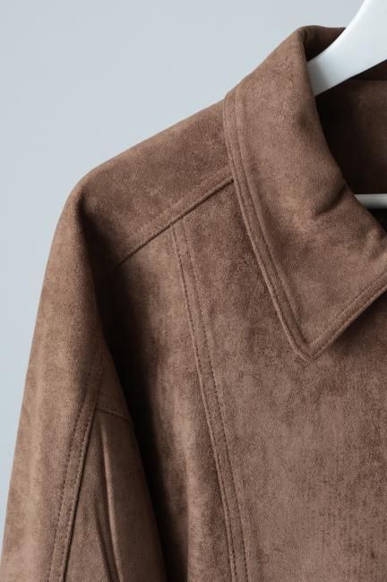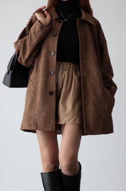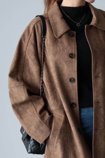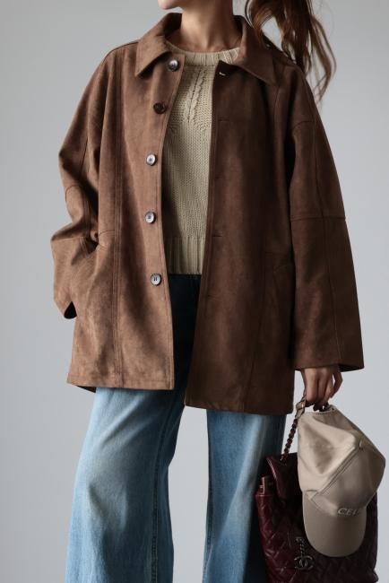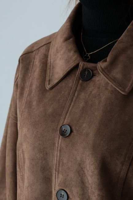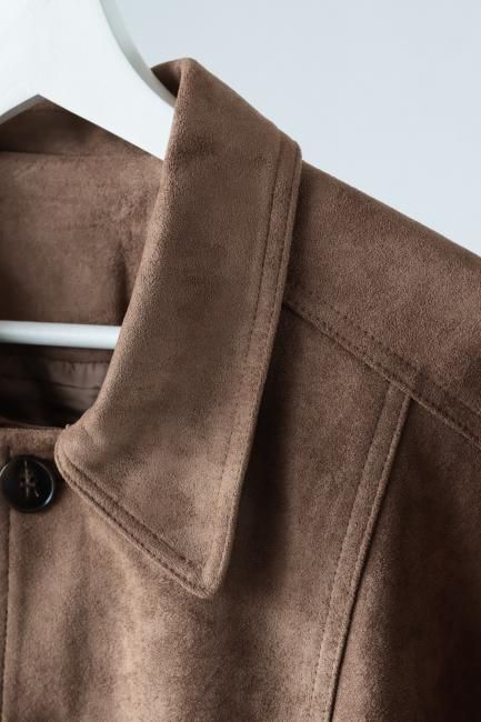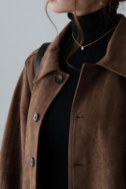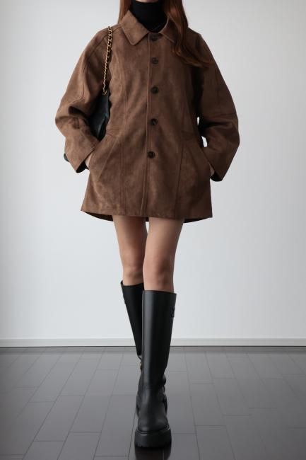 肌触りの良いスエード生地を使用したマニッシュな雰囲気でお召しいただけるスエードミディコート。
