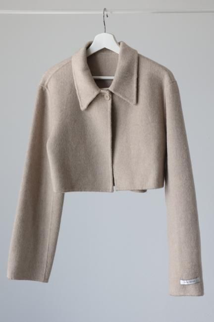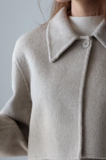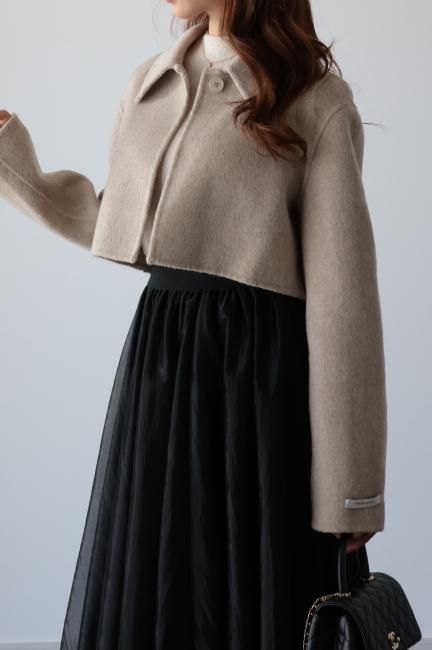 襟元のワンボタンがポイントになったハンドメイドウールクロップコート。