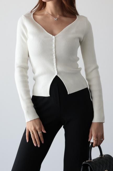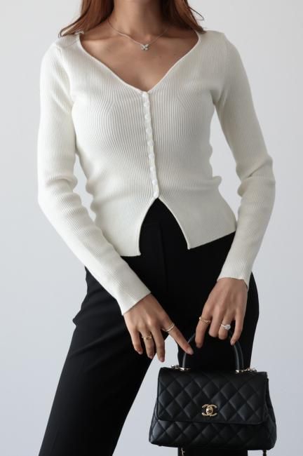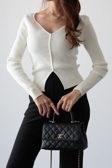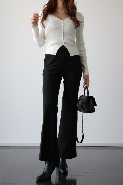 フロントには小さなボタンが付いており、ボタンを数個開けて中にキャミソールやタンクトップをレイヤードするのもおすすめです。