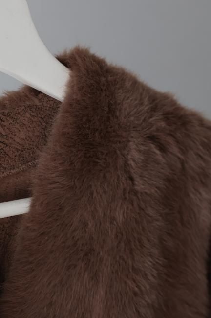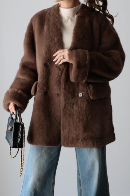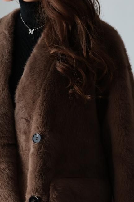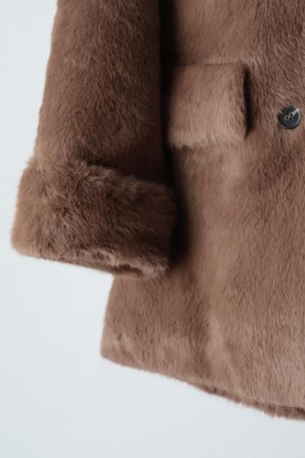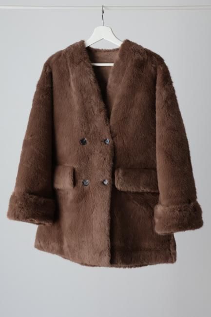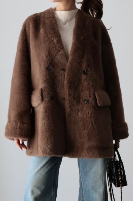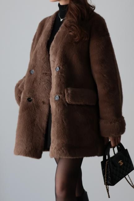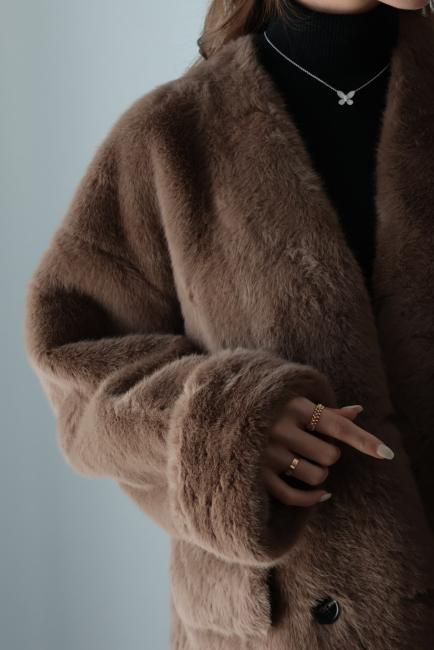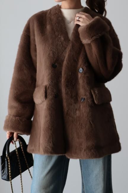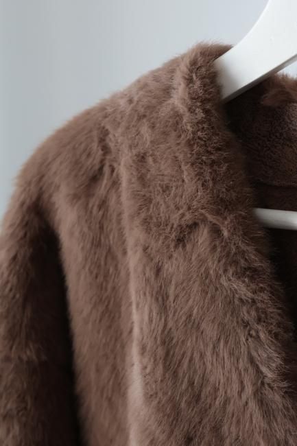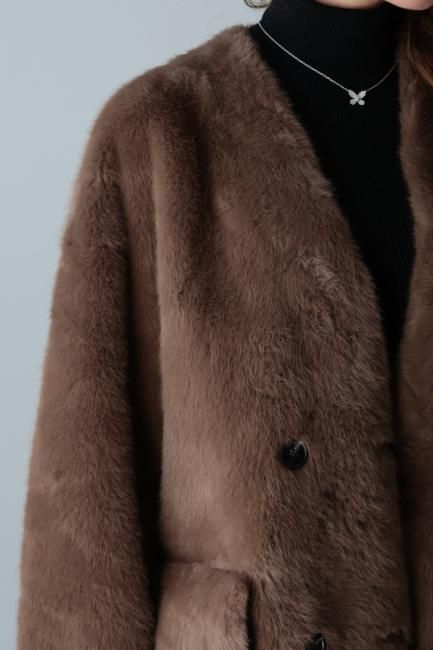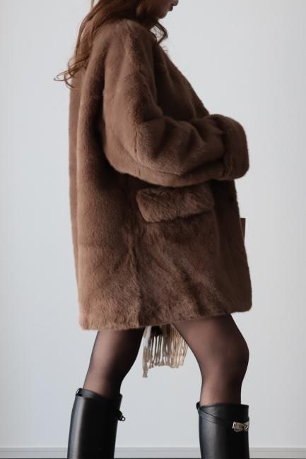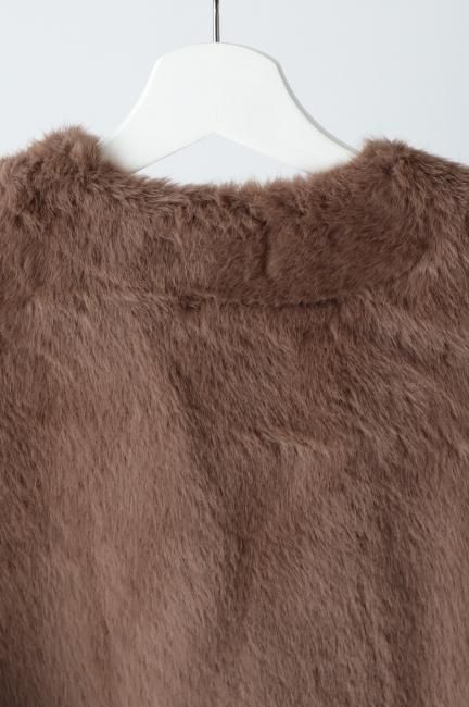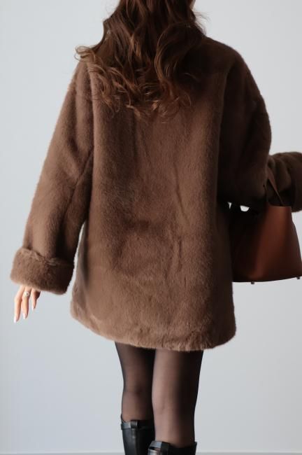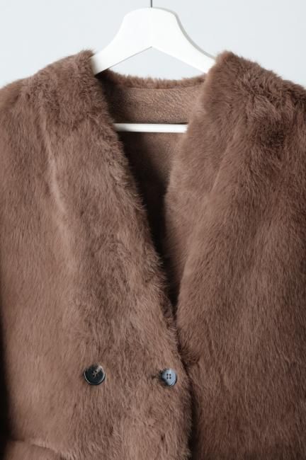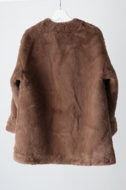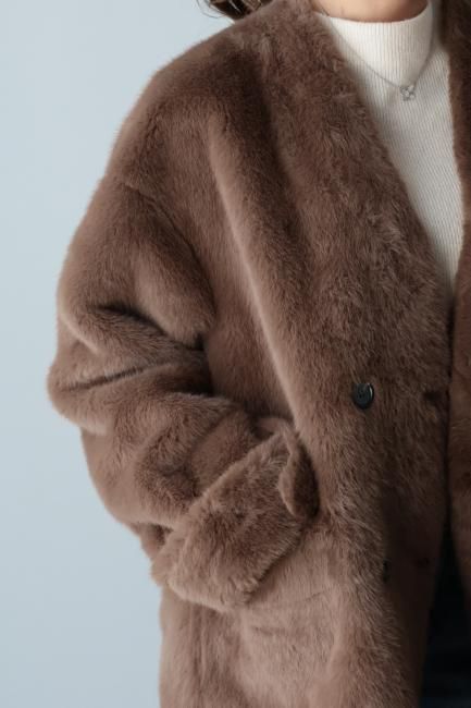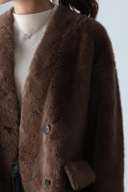 ミンク調の高級感のあるエコファーを使用したノーカラーミディファーコート。