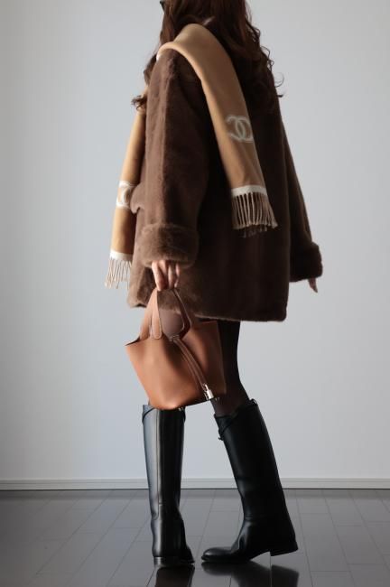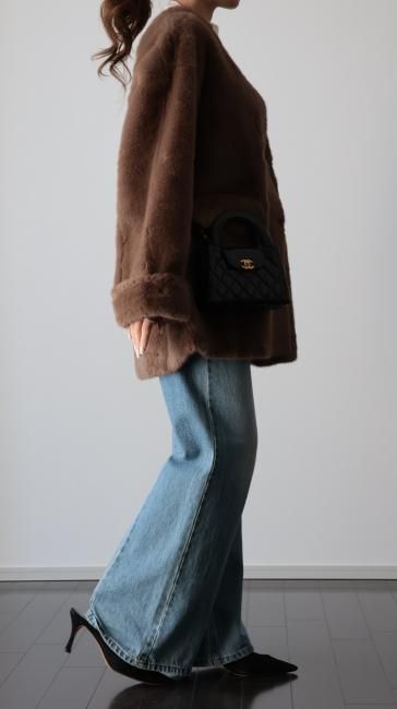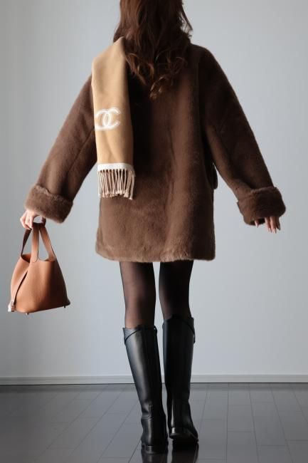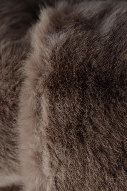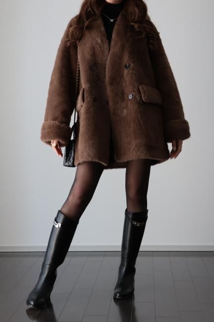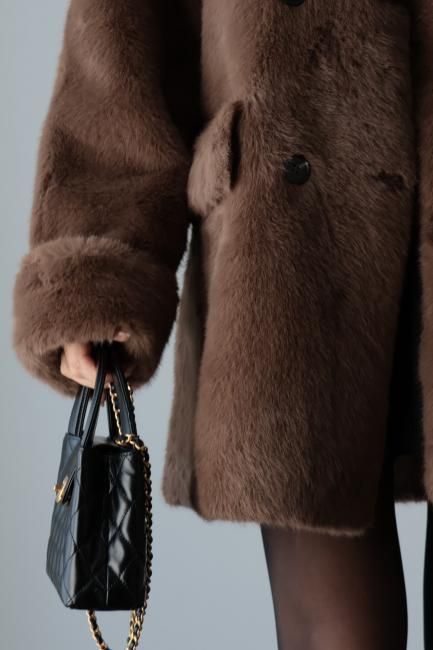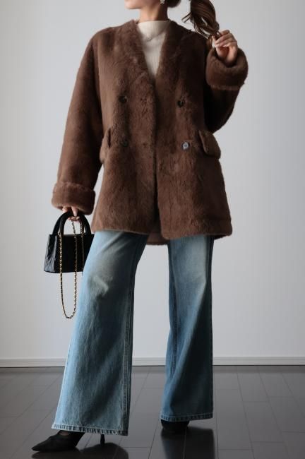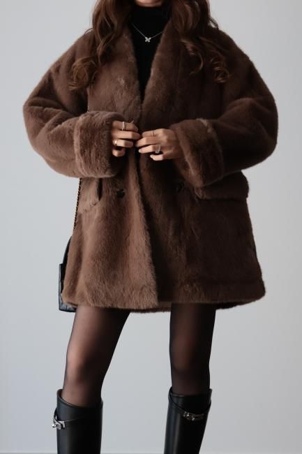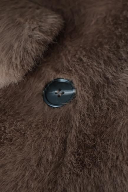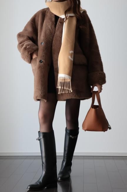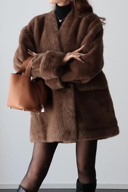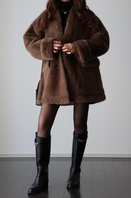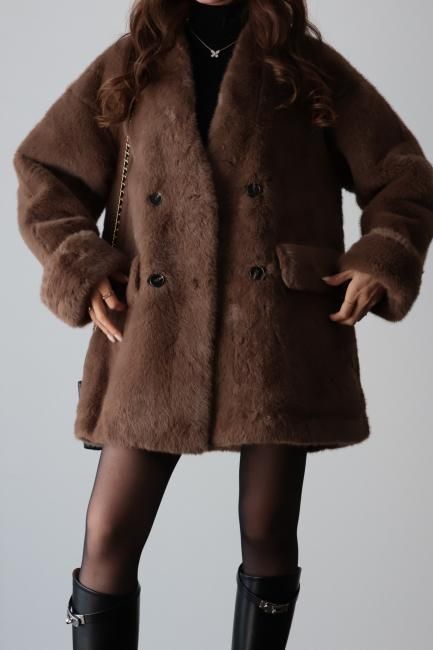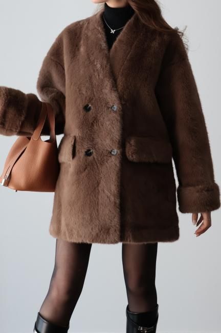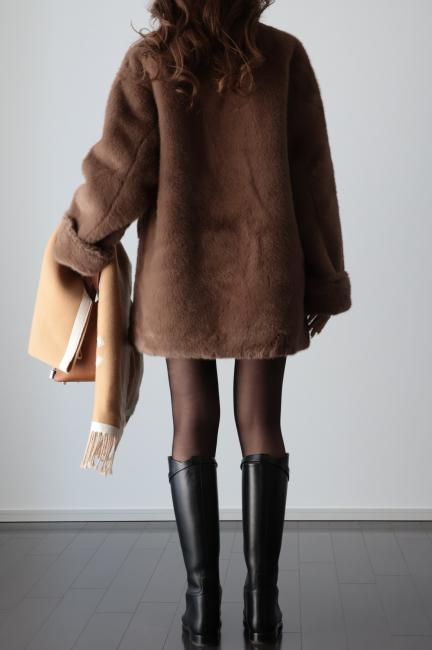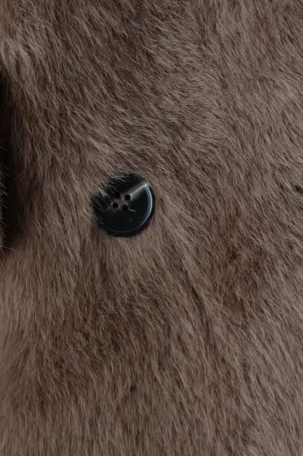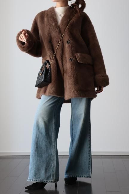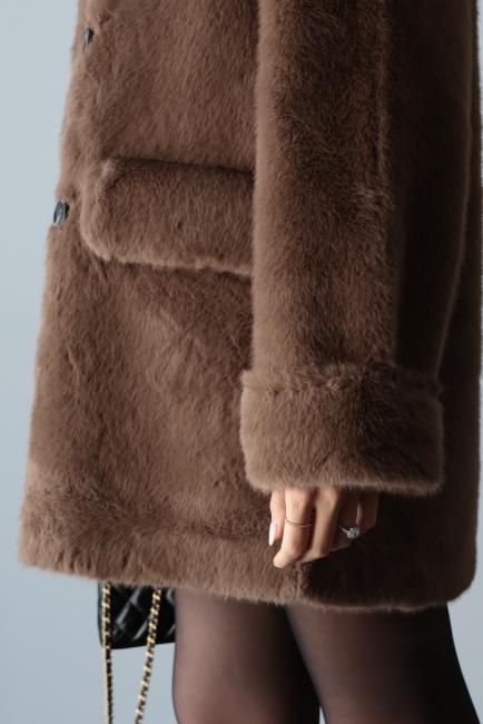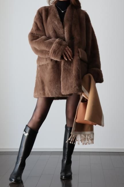 ミンク調の高級感のあるエコファーを使用したノーカラーミディファーコート。