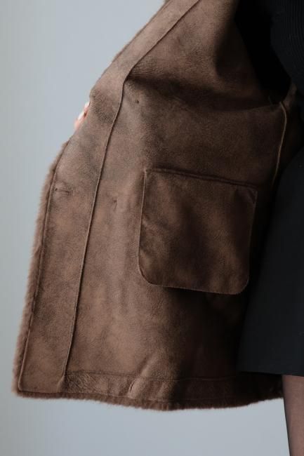 裏地は滑らかなスエード素材て着心地が良く、またアームホールは広めに取られておりますので、厚みのあるニットを着ても着膨れすることなく羽織ってもいただけます。