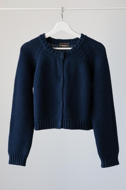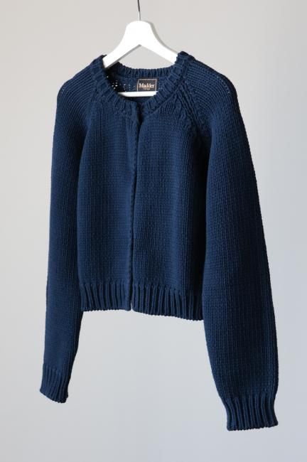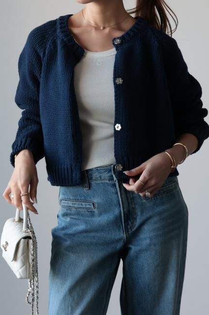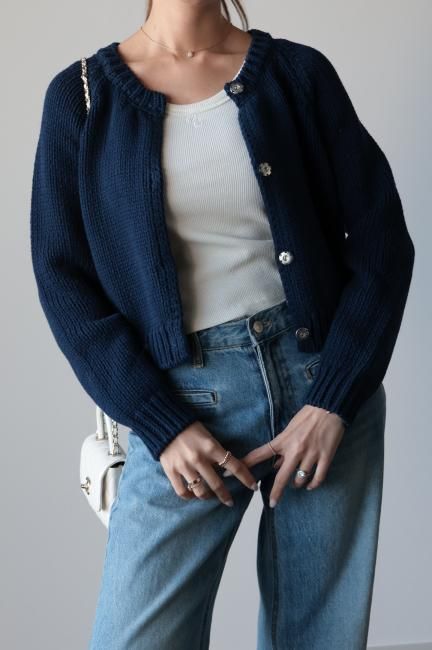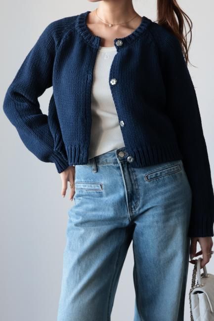 ラウンドネックにシルバーボタンがポイントになった2WAYコットンニットカーディガン。