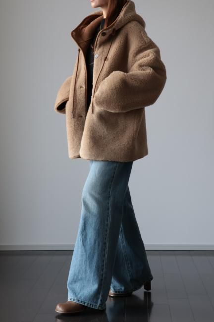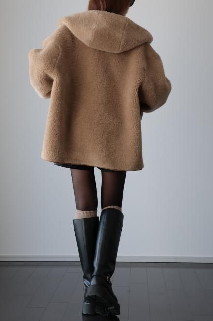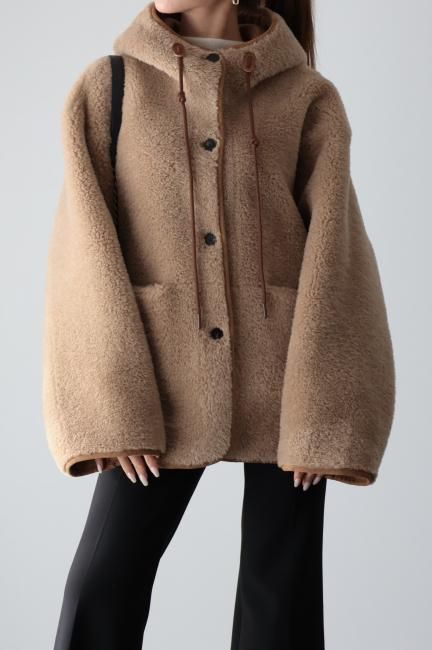 表地はふわふわのボア、内側にはムートンの風合いを再現したシンセティックムートン素材を使用したフーデッドオーバージャケット。