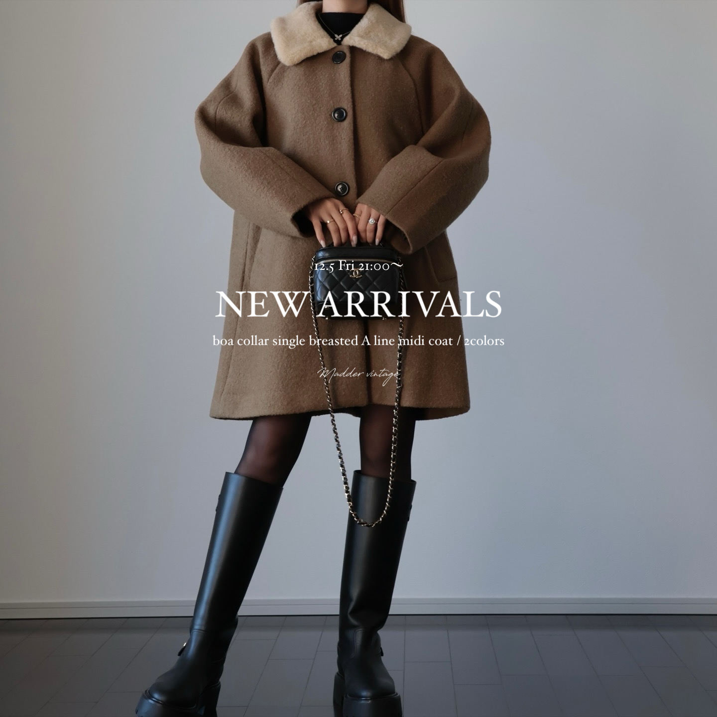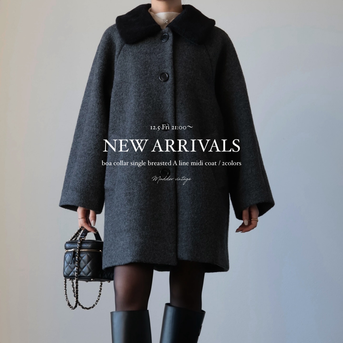 ▼boa collar single breasted A line midi coat / 2colorways